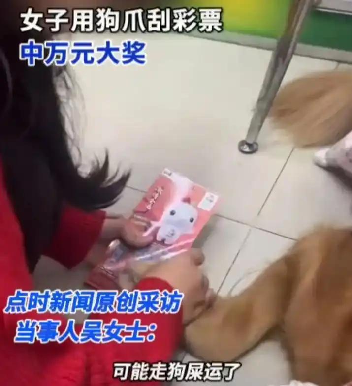 广东深圳,吴女士告诉点时新闻,当天她出门遛狗时不小心踩到了狗屎,朋友打趣说这是要走“狗屎运”,提议她去买张刮刮乐试试手气。吴女士听后便带着狗狗走进彩票站,花20元买了一张刮刮乐。吴女士说,她觉得好玩索性让狗狗用爪子帮忙刮奖,本以为只是图个乐子,没想到竟中了1万元奖金!吴女士表示又惊喜又意外。