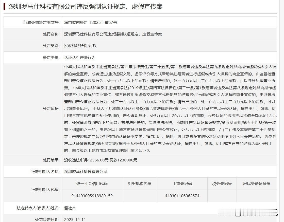 【罗马仕被罚没124万 罗马仕违反强制认证规定被罚没124万】 天眼查天眼风险信息显示,近日,深圳罗马仕科技有限公司因违反强制认证规定、虚假宣传,被深圳市市场监督管理局南山监管局没收违法所得1.2万余元、罚款123万元。 该公司成立于2012年3月,法定代表人为雷社杏,注册资本600万人民币,经营范围包括国内贸易、经营进出口业务、服装的设计及销售等。股东信息显示,该公司由雷桂斌、雷灿伙共同持股。 据报道,此前,罗马仕因充电宝起火爆炸,陷入高校禁用、旧品召回、民航禁令、员工讨薪等困境。 天眼查信息: