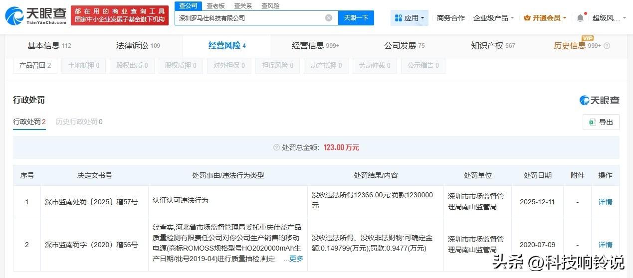 【罗马仕被罚没124万罗马仕违反强制认证规定被罚没124万】 天眼查天眼风险信