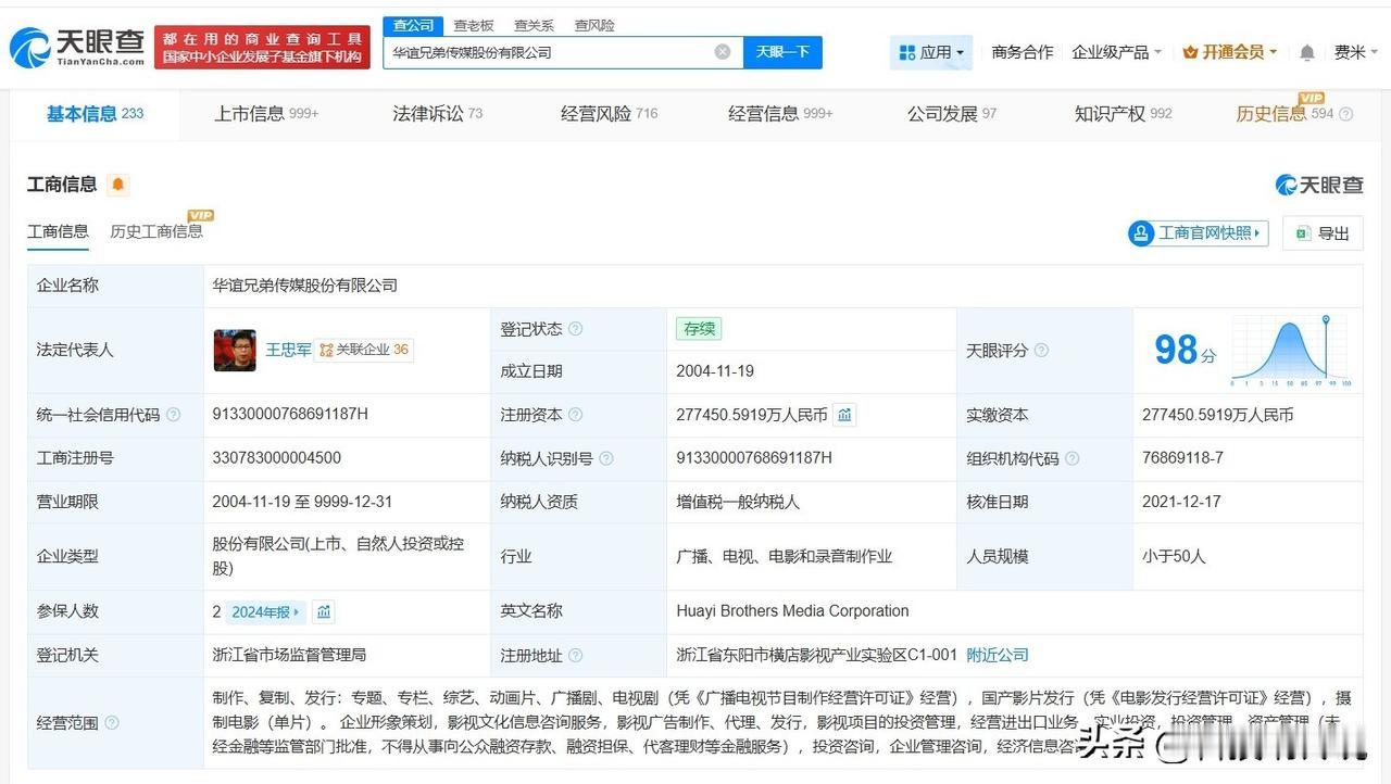 【华谊兄弟及王忠军被限消 华谊兄弟因1140万案款被限消 王忠军因1140万案款被限消】 天眼查法律诉讼信息显示,近日,华谊兄弟(300027)及其法定代表人王忠军新增一则限制消费令,涉及广告合同纠纷案件,申请人为北京泰睿飞克科技有限公司,执行法院为北京市朝阳区人民法院。案件流程信息显示,此前,该公司已被执行1140万余元。 华谊兄弟传媒股份有限公司成立于2004年11月,法定代表人为王忠军,注册资本约27.7亿人民币,经营范围包括企业形象策划、影视文化信息咨询服务、影视项目的投资管理等,由王忠军、杭州阿里创业投资有限公司、马云等共同持股。 据媒体报道,近期,该公司公告称,受经济形势影响,公司因部分回款资金未能如约到位,造成暂时性流动资金紧张,出现债务逾期5250万元。 天眼查信息:
