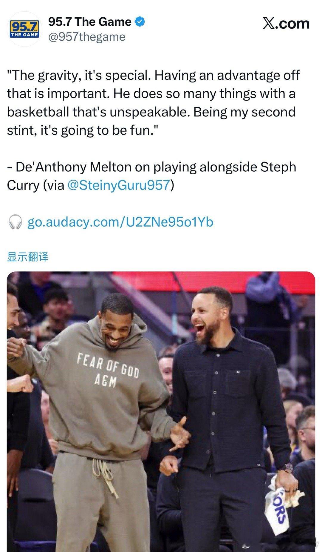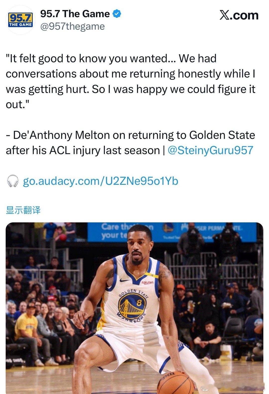 梅尔顿做客湾区电台梅尔顿表示,很高兴上赛季重伤后仍能回到勇士队。“在我受伤期间,我们确实讨论过回归的事情。得知你们希望我回来,感觉很好。很高兴我们最终解决了这个问题。”谈到再次和库里搭档梅尔顿说到:“能利用库有引力这样的优势非常重要,他能用篮球做到很多匪夷所思的事情,这是我第二次和他搭档,比赛会很有趣。”