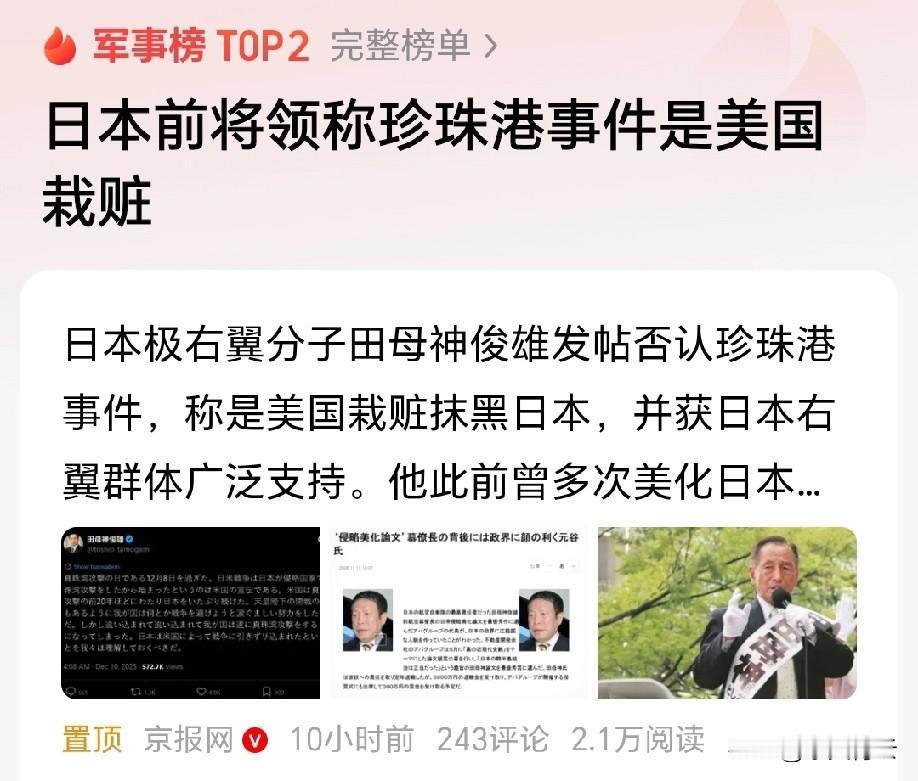 美国纪念珍珠港时还刻意捧日本当盟友,结果被田母神俊雄反手捅一刀——说珍珠港事件是美国栽赃,这操作绝了! 网上都笑美国被打脸了,要知道田母神是自卫队前高官,和首相高市早苗私交甚密,17年前歪曲珍珠巷历史,还拿到了6000万日元退休金,由此可见这些日右翼份子的势力有多大。 美国纵容日本右翼搞历史修正,以为能当棋子用,殊不知这是养虎为患。右翼连珍珠港旧账都敢翻,未来哪会真听美国的?这不是背刺,是日本极右翼在亮肌肉啊!