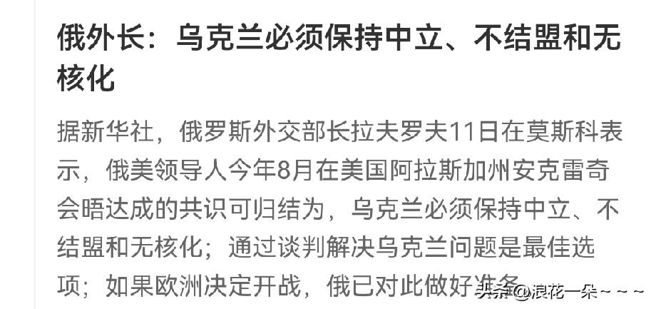 快讯!快讯! 就在刚刚,俄外长拉夫罗夫强势发话了!如果欧洲决定开战,俄已做好应战准备!同时,他在乌克兰问题上表示——乌克兰必须保持中立、不结盟和无核化! 在我看来,俄罗斯外长的这一态度显然对欧洲是非常强势的,也许是在回应此前欧洲个别国家的言论吧。 德国不是有高级将领说已经做好对俄罗斯开战的准备了吗?北约秘书长吕特也说战争即将来临。匈牙利总理欧尔班曾提醒俄罗斯说,欧州决定在2030年前跟俄罗斯开战。 但是,在乌克兰问题上我感觉是不是俄罗斯松口了呢?因为俄外长没有说领土问题,不结盟的话不就是不加入欧盟和北约吗?保持中立和无核化对乌克兰来说应该也不难呀。难就难在乌克兰不想出让领土,然后俄外长却没有说领土问题,也许领土是还可以再谈的吧。