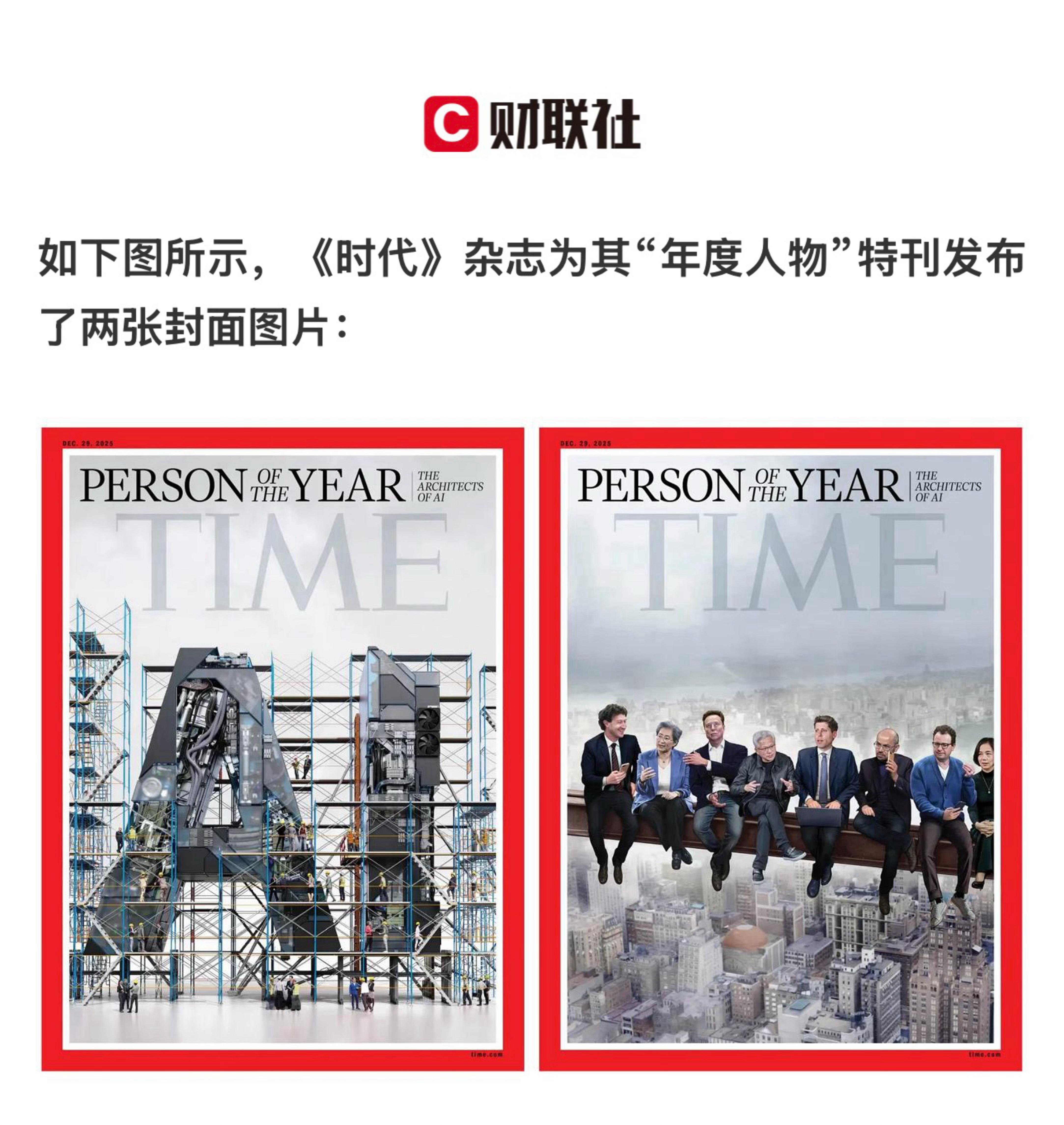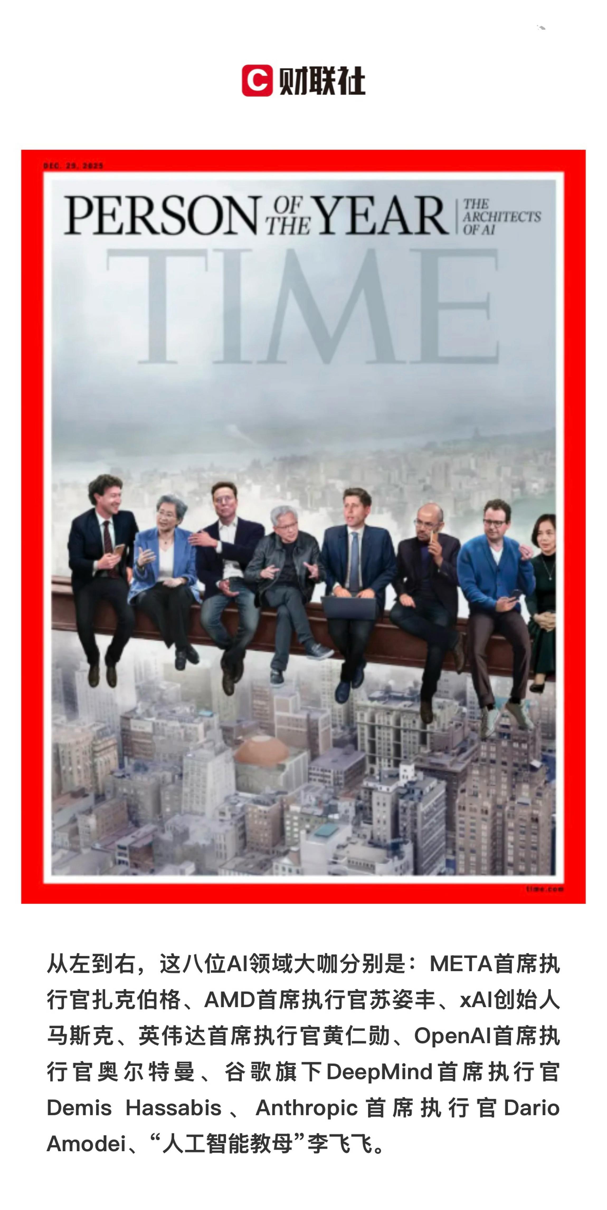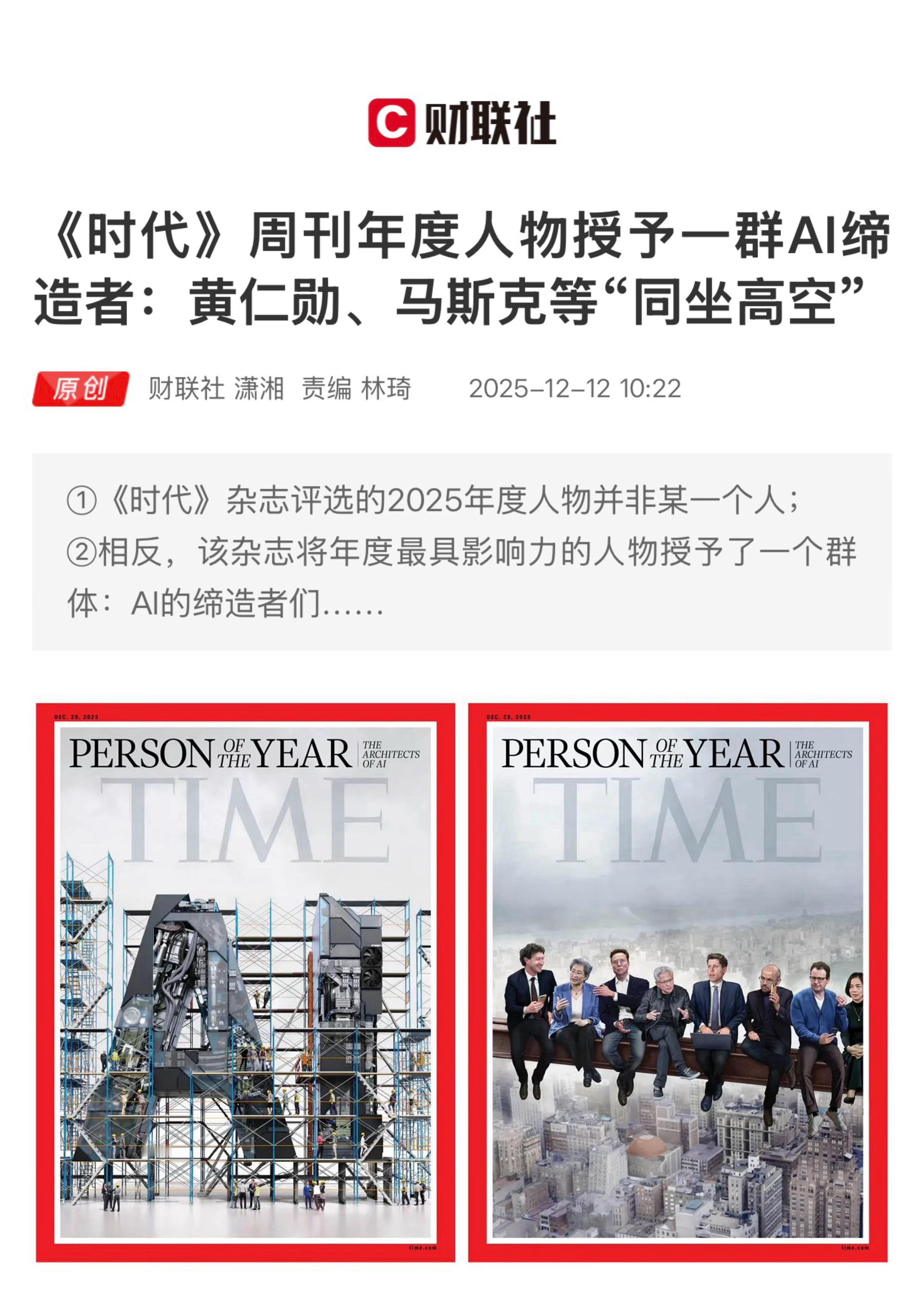 【 《时代》周刊年度人物授予一群AI缔造者:黄仁勋、马斯克等“同坐高空”】 (财联社 2025-12-12 10:22 ) 『 要点:《时代》杂志评选的2025年度人物并非某一个人,该杂志将年度最具影响力的人物授予了一个群体——AI的缔造者们…… 』 财联社12月12日讯 《时代》杂志评选的2025年度人物并非某一个人;相反,该杂志将年度最具影响力的人物授予了一个群体——AI的缔造者们…… 当地时间本周四(12月11日),《时代》周刊杂志宣布,AI的缔造者们当选成为《时代》周刊2025年度人物。该杂志表示,今年是人工智能全部潜力真正轰然爆发的一年,其发展趋势已是大势所趋,触及了我们生活的方方面面,从经济到教育。正是这群人开创了“思考型机器”的时代——既让全人类惊叹不已,也让人们心怀忧虑;他们重塑了当下,也突破了诸多可能性的边界。 如图2 所示,《时代》杂志为其“年度人物”特刊发布了两张封面图片。其中,左边这张是艺术作品,描绘被脚手架工人环绕的“AI”字母,由插画师兼图形动画师彼得·克罗瑟创作。 另一幅封面(图3 )则聚焦当前科技行业的领袖们——八位成功人士坐在横于高空的钢梁上,背景是城市天际线。该设计致敬经典纽约摄影作品《摩天大楼上的午餐》,但将铁匠工人们替换为了科技界人物。 在这张封面中,从左到右,八位AI领域大咖分别是:META首席执行官扎克伯格、AMD首席执行官苏姿丰、xAI创始人马斯克、英伟达首席执行官黄仁勋、OpenAI首席执行官奥尔特曼、谷歌旗下DeepMind首席执行官Demis Hassabis、Anthropic首席执行官Dario Amodei、“人工智能教母”李飞飞。 值得一提的是,这并非《时代》杂志“年度人物”首次授予大型团体——2014年其曾颁发给埃博拉抗疫者、2002年则曾授予过“吹哨人”群体。 《时代》杂志在公布新封面时指出:“今年关于如何负责任地运用人工智能的讨论,已让位于尽可能快速部署该项技术的竞赛……那些聚焦规避风险的人不再掌握主动权了”。 “多亏了黄仁勋、孙正义、奥特曼和其他AI行业的巨头们,人类现在正全速前进,没有刹车,朝着高度自动化和高度不确定的未来飞驰而去。” 该杂志主编萨姆·雅各布斯表示,在2025年,“没有人”比“那些构想、设计和构建人工智能的人”产生更大的影响。“人类将决定人工智能的发展方向,我们每个人都能在塑造其架构与未来中发挥作用。”他如是说道。 Forrester分析师Thomas Husson则点评称,2025年可能被视为人工智能在我们日常生活中使用频率的“转折点”。“大多数消费者在使用它时甚至都没有意识到这一点,人工智能现在正被塞进硬件、软件和服务中——这意味着它的普及速度比互联网或移动革命时期快得多”。 Fountech AI实验室的创始人兼首席执行官Nik Kairinos表示,这些封面是对AI这项技术影响力的“真实评估”。但他认为“认知度不应与准备程度混为一谈”。“当前人工智能仍可能成为人类的救星或祸患,我们构建可靠、可追责且符合人类价值观的人工智能系统仍处于初级阶段。对于开发技术并推动人工智能工具商业化的从业者而言,肩负着重大责任。” ▪️衍生话题: 投资者得小心《时代》周刊魔咒重演? 有意思的是,尽管《时代》周刊年度人物授予AI缔造者,对人工智能行业来说本身是一件好事,但一项历史魔咒却可能值得投资者有所警惕:潜在的杂志封面诅咒。 Bianco Research总裁Jim Bianco在X平台就发文直指此问题,他指出《时代》年度人物“历来是绝佳的逆向指标”。 Spectra Markets总裁Brent Donnelly经数据分析也发现,《时代》年度人物作为投资反向指标的有效性非常显著。尽管《时代》周刊年度人物选定企业领袖或特定行业的样本量较小——Donnelly统计显示迄今仅有九次案例(含今年),但魔咒的成功率却令人惊讶。 据Donnelly统计,与年度人物相关的投资趋势或公司,仅有13%在一年后表现更佳,两年后这一比例也仅堪堪升至25%。 历史上,唯一一家在上年度封面后第二年没有被抛售的公司是英特尔——其联合创始人兼时任CEO安迪·格鲁夫于1997年获选“年度人物”。不过,几年后随着互联网泡沫破裂,英特尔股价其实也遭受了重创。 “这一统计结果绝对令人惊讶,”Donnelly指出,“这又拼凑出一块拼图,表明AI主题已经是常识,因此很难理解为什么像英伟达这样的股票还能继续斩获超额收益。” Yardeni Research总裁Ed Yardeni也指出,他认为“杂志封面诅咒”可能会再次应验。“这绝对是一种潜在的诅咒。” 本周早些时候,Yardeni刚刚放弃了过去15年来一直建议增持信息技术和通信服务板块股票的投资组合策略——这两个板块都高度依赖人工智能。Yardeni指出,“人工智能交易正演变成一场‘权力的游戏’。过去,七巨头各自拥有护城河环绕的王国,享有独特垄断地位。如今它们在人工智能竞赛中相互角逐,彼此的王国正面临威胁。” 事实上,类似《时代》周刊等杂志魔咒背后的逻辑并不难理解,概括下来无外乎四个字:大热必死。人怕出名猪怕壮,当热门投资主题登上《时代》杂志等大众刊物封面时,该主题的盛况往往即将终结。 Ritholtz财富管理公司联合创始人Barry Ritholtz指出,当投资趋势引起《时代》等主流综合类刊物编辑关注时,多数投资机会其实已然错失。 网页链接