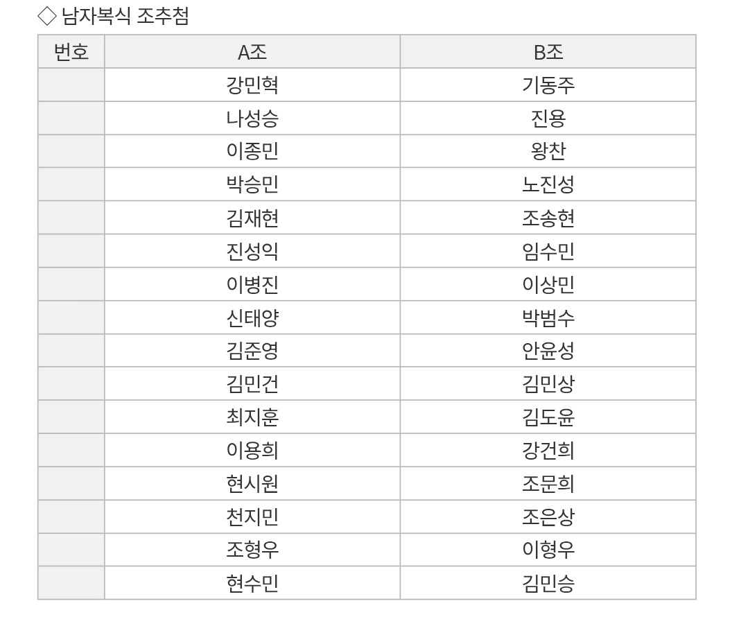 bka2026国代选拔 双打男分组(只写我熟的)A组:姜珉赫,罗圣胜,李钟民,朴升民,金在贤,真诚翊,申太阳,赵炯宇,玄秀民B组:奇东柱,真龙,王灿,赵松炫,林秀民,朴范秀,安允成,李亨雨,金民胜