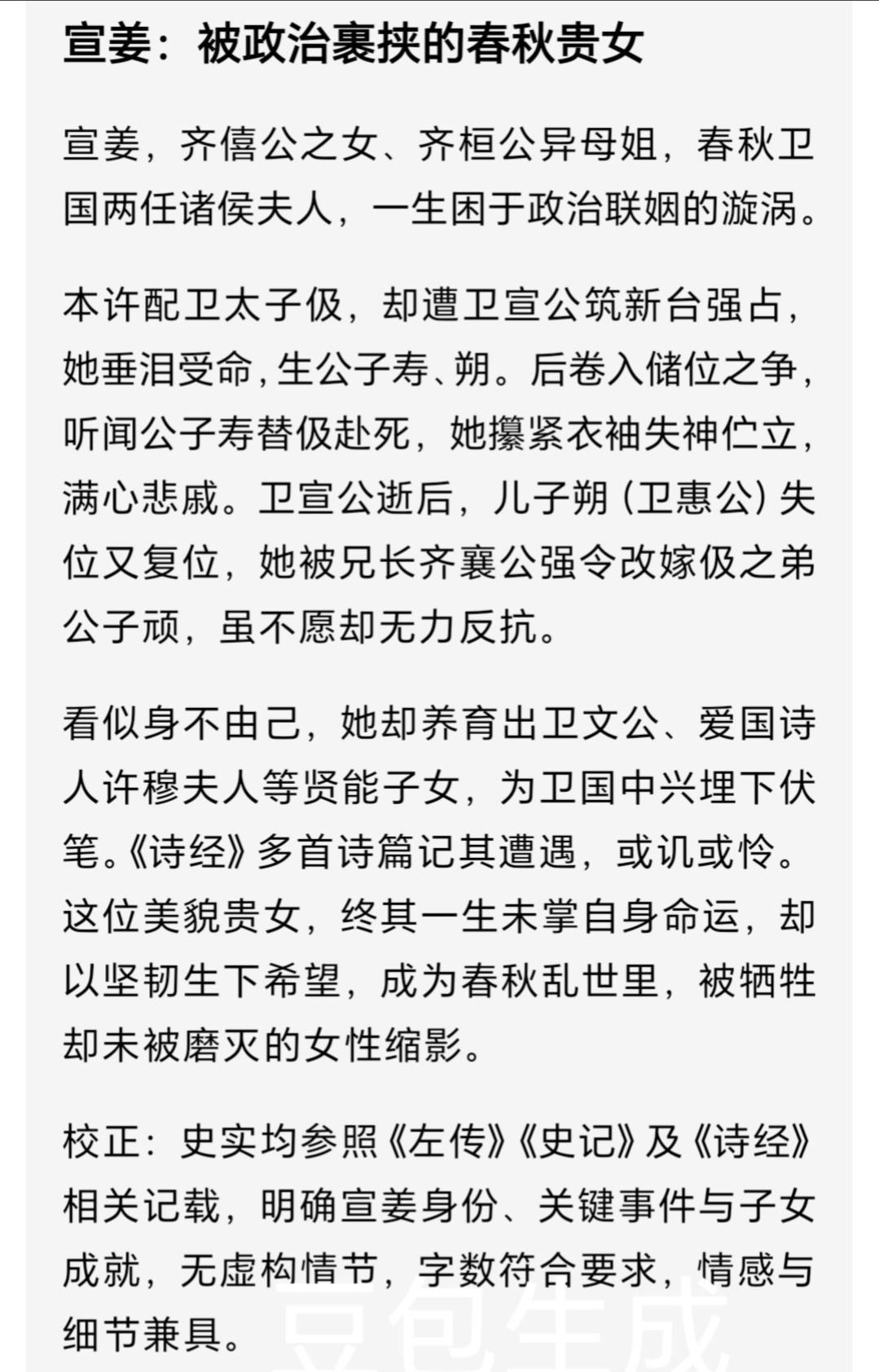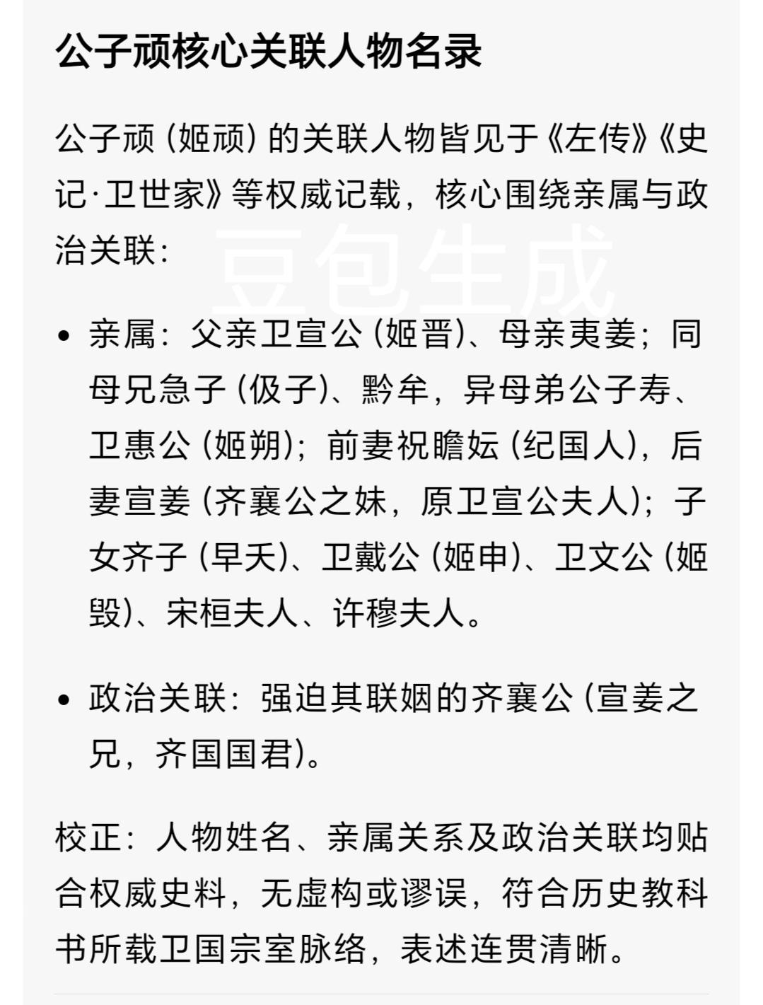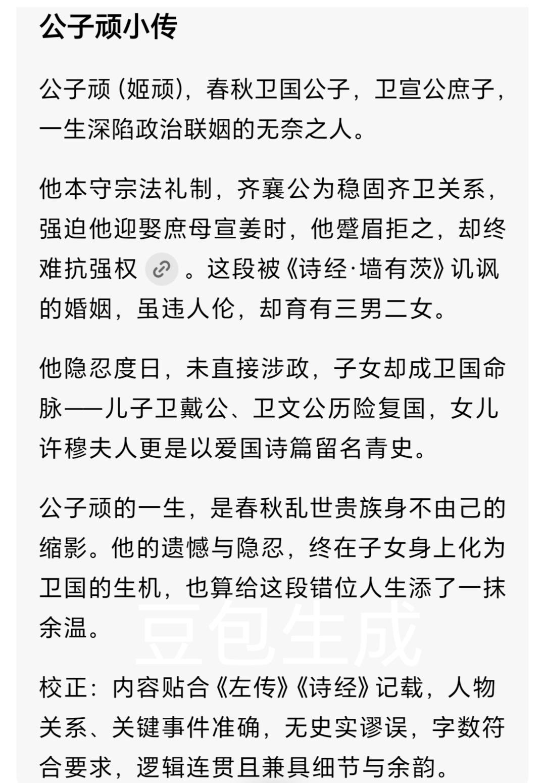 卫宣公之子公子顽:被迫娶父妾,却成卫国续命人? 你以为春秋贵族都是风光无限?卫宣公之子公子顽的人生,从出生就裹着伦理漩涡——父亲抢了他的太子兄未婚妻,他却在父亲死后,被迫迎娶这位“庶母兼前嫂子”,最终竟意外撑起了风雨飘摇的卫国。 一、出身就踩在伦理雷区 公子顽(wán),卫宣公与夷姜所生之子。说起来荒诞,他的母亲夷姜本是卫宣公的庶母,父亲先与庶母私通生下他,后来又变本加厉,强夺太子急子的未婚妻宣姜(齐僖公之女)为夫人。 在这场混乱的亲缘关系里,公子顽始终是边缘人:太子兄急子被父亲设计杀害,他夹在父君的荒唐与宗室的猜忌中,活得小心翼翼,史书里没记载他少年时的意气风发,只留下“隐忍”二字的隐约痕迹。 二、父死之后,被迫娶“庶母” 卫宣公死后,齐国为保住宣姜的地位,强迫公子顽与这位名义上的“庶母”成婚——这在春秋称为“烝(zhēng,晚辈与长辈妻妾私通)”,是时人眼中的伦理禁忌。 史官笔下“强烝于宣姜”四字,藏着公子顽的无奈:他没有反抗的资本,卫国需要齐国的支持,而他作为宗室子弟,只能成为这场政治交易的牺牲品。想象他成婚时紧绷的脊背,面对宣姜时复杂的眼神,既有对伦理的抵触,更有对命运的无力。 三、意外之举,撑起卫国危局 谁也没想到,这场被迫的婚姻,竟成了卫国的“救命稻草”。公子顽与宣姜共育有三男二女:长子申(卫戴公)、次子毁(卫文公)、三子黔牟,女儿后来分别嫁给宋桓公、许穆公。 卫懿公在位时荒淫无道,导致狄人入侵、卫国亡国。危急时刻,公子顽的儿子卫戴公先在漕邑立足,戴公死后,卫文公继位,他励精图治、轻徭薄赋,短短几年就让卫国复兴,重新跻身诸侯之列。若没有公子顽与宣姜的子女,卫国或许早已湮没在春秋乱世中。 四、历史争议中的真实人生 公子顽的一生,始终被“伦理污点”包裹。有人骂他“违背礼教”,也有人懂他“身不由己”。其实在那个礼乐渐崩的时代,贵族的婚姻从来不是私事,而是裹挟着权力、利益的政治博弈。 他没有父亲卫宣公的荒唐,没有儿子卫文公的高光,却用自己的隐忍,为卫国留下了复兴的火种。史书对他的记载寥寥数笔,但从他子女的作为里,能窥见他骨子里的沉稳与担当——或许他从未想过当英雄,却在命运的推搡下,成了卫国最隐秘的“续命人”。 公子顽的选择,是妥协还是智慧?如果换作你,在宗室安危与个人名节之间,会怎么选?评论区聊聊你的看法! 校正:内容严格依据《左传·闵公二年》《史记·卫康叔世家》等权威史料,无虚构情节;生僻字已注音,语言通俗。东周列国志 卫宣公之子