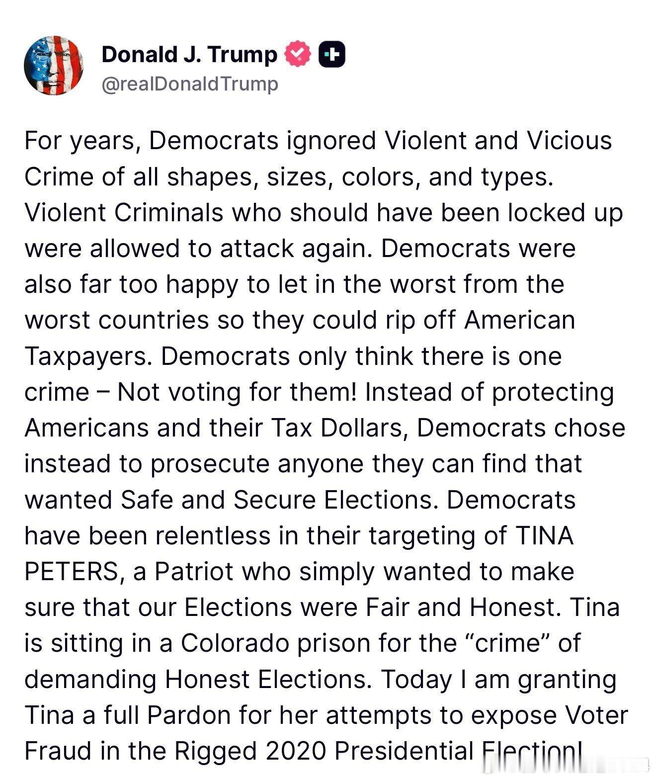 重大突发:川普总统宣布特赦蒂娜·彼得斯(Tina Peters),这位因揭露 2020 年选举舞弊而被囚禁在科罗拉多的举报人!川普声明说:“多年来,民主党人忽视了各种形式、大小、颜色和类型的暴力和恶性犯罪。本应被关押的暴力罪犯被允许再次攻击。民主党人也非常乐意让最坏的国家进入最坏的国家,这样他们就可以宰割美国纳税人。民主党人只认为有一种罪行——不投票给他们!民主党人没有保护美国人和他们的税款,而是选择起诉任何他们能找到的想要安全可靠的选举的人。民主党人一直无情地针对蒂娜·彼得斯,蒂娜·彼得斯是一个爱国者,他只是想确保我们的选举是公平和诚实的。Tina因要求诚实选举的“罪行”而坐在科罗拉多州的监狱里。今天,我给予Tina完全赦免,因为她试图在2020年被操纵的总统选举中揭露选民欺诈!”背景资料:蒂娜·彼得斯(Tina Peters)作为前科罗拉多州梅萨县选举官员,在2020年美国总统大选后声称揭露选举舞弊。本着对选举诚信的承诺,她保存了2020年选举数据镜像,以防Dominion系统更新时“销毁证据”。她允许专业人士检查设备,揭露潜在漏洞和异常(如算法预测、死人投票痕迹),并递交了83页“法医报告”,指控更新过程中存在文件删除、密码泄露和违规操作,暗示Dominion系统被篡改以实现2020年舞弊。这些本应是保护选民的正当行为,却被民主党主导的科罗拉多州检察系统定性为“犯罪”,判了她9年重刑。海外新鲜事海外新鲜事美国大选舞弊民主党丧心病狂