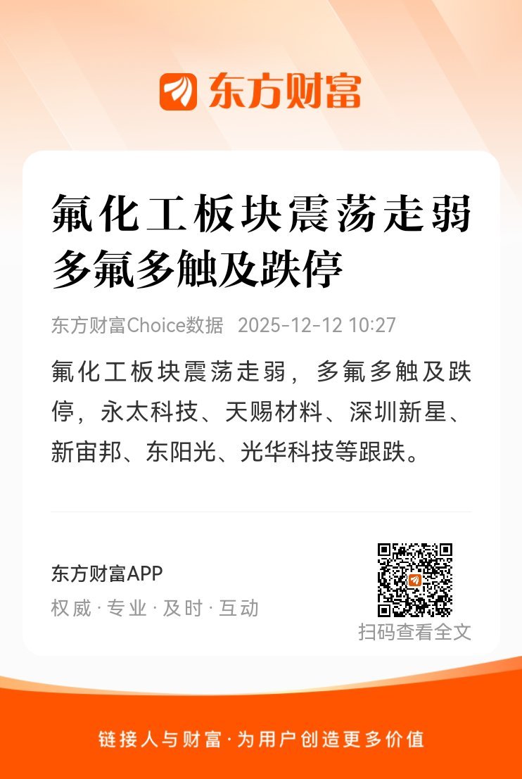 东方财富股票【氟化工板块震荡走弱 多氟多触及跌停】氟化工板块震荡走弱,多氟多触及跌停,永太科技、天赐材料、深圳新星、新宙邦、东阳光、光华科技等跟跌。氟化工板块震荡走弱 多氟多触及跌停 (来自
