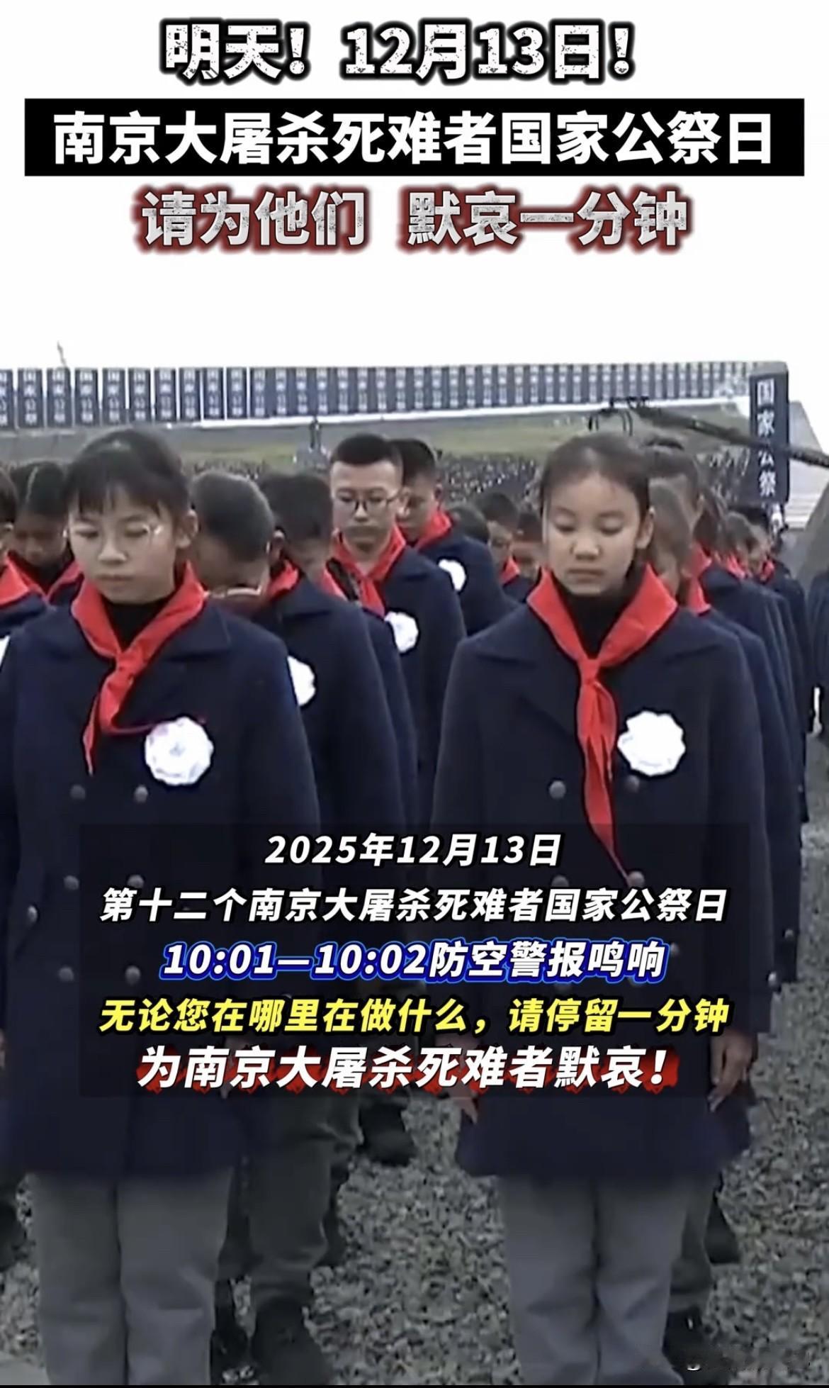 2025年12月13日,是第十二个南京大屠杀死难者国家公祭日。 10:01 - 10:02防空警报鸣响时,无论身处何地、正在做什么,都请停留一分钟,为南京大屠杀死难者默哀。 1937年12月13日起,侵华日军在南京进行了40多天惨绝人寰的大屠杀,30万同胞惨遭杀戮。 2014年,国家以立法形式将12月13日设为国家公祭日。2018年,“默哀一分钟”被列入法规。这一分钟,是对逝者的尊重,是对历史的铭记,更是对未来和平的期许。让我们共同缅怀先烈,珍视和平。