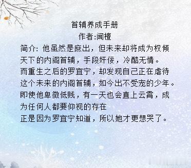 推文 首辅养成手册作者:闻檀简介: 他虽然是庶出,但未来却将成为权倾天下的内阁首辅,手段奸佞,冷酷无情。而重生之后的罗宜宁,却发现自己正在虐待这个未来的内阁首辅,如今出不受宠的少年。即使他卑微低贱,有一天也会直上云霄,成为任何人都要仰视的存在正是因为罗宜宁知道,所以她才更想哭了。