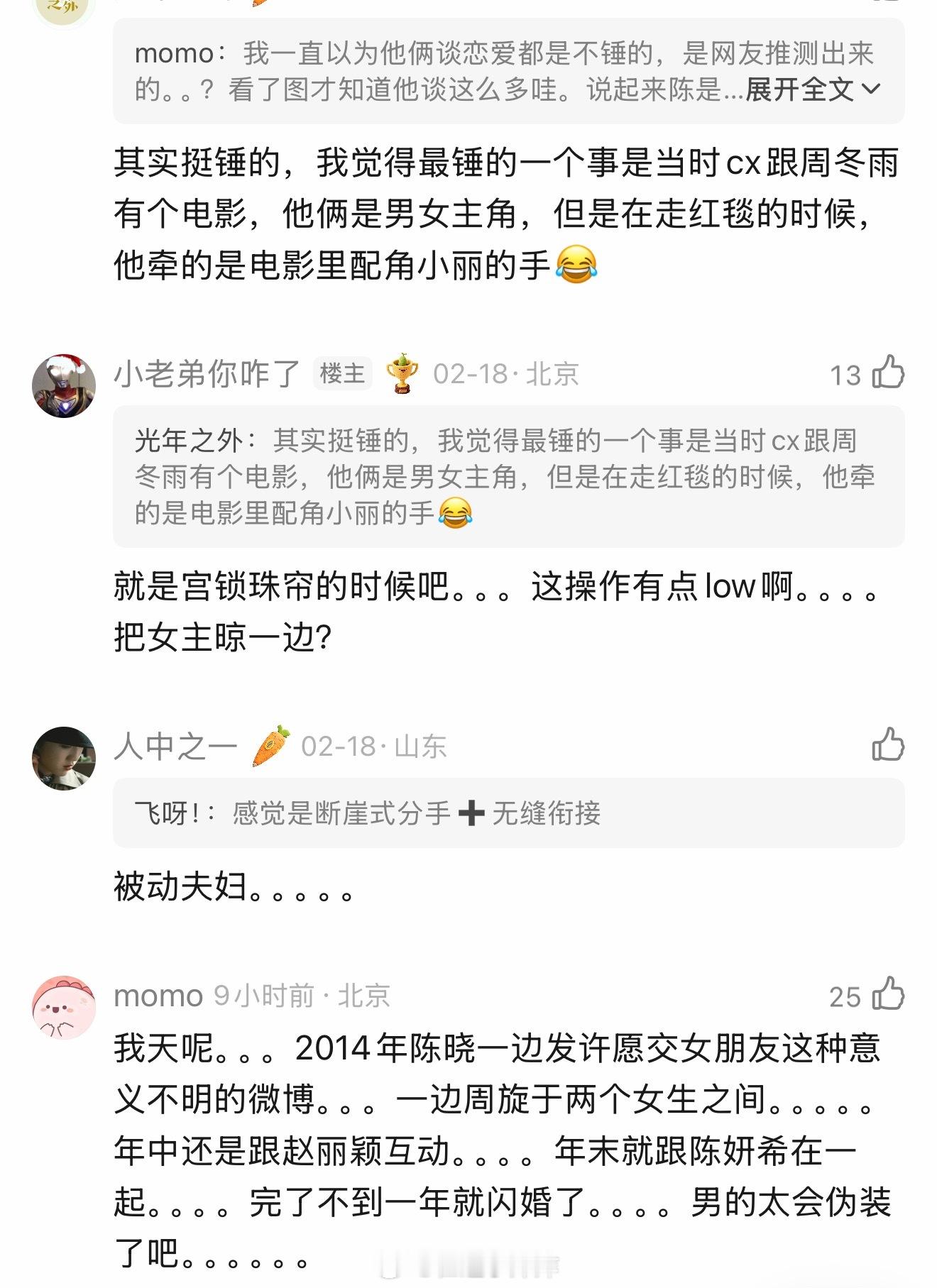 考古双陈恋恋爱初期双陈和赵丽颖的交叉时间线,从14年8月就很混乱了据于歪小作文的说法男方断崖式分手,闪婚后又回头找女方演深情…陈妍希爸爸送多年前的衣服给陈晓穿陈妍希爸爸将陈晓以半子待之