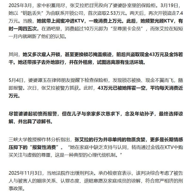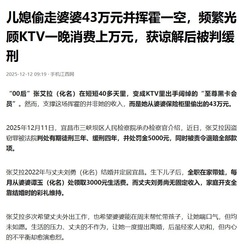 这明显是一种对婆婆和丈夫的报复行为,她也明知道最终婆家会谅解她,不用受到什么惩罚,所以才如此肆无忌惮。可能儿媳妇觉得婆婆的钱也是家和她的,可以随意取用不算偷;也可能觉得婆婆不愿意帮她带娃就故意破坏家里的经济状况,通过这种方式达到离婚目的。结婚后婆婆每月给她发3000元生活费,娶这样的儿媳妇到底是为什么?让人叹息。