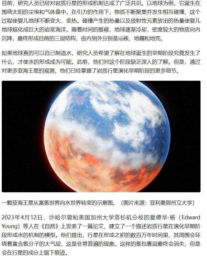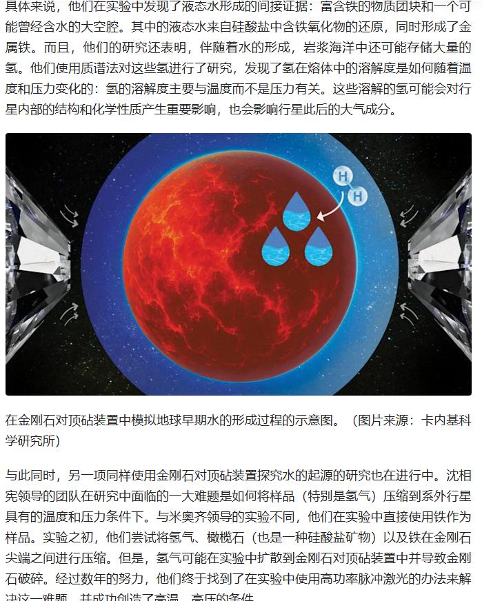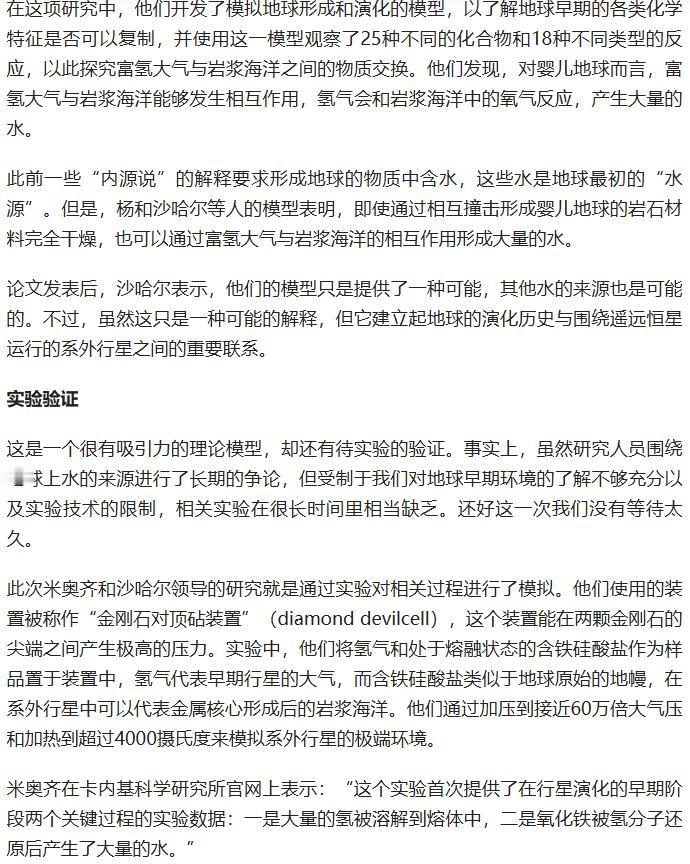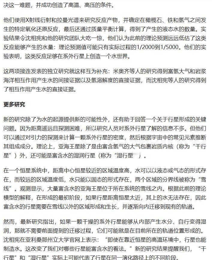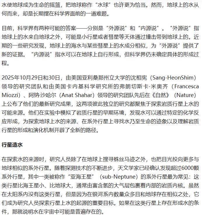 地球这颗 “水球” 的生命之源究竟来自何方?两项登载于《自然》的重磅研究给出了颠覆性线索! 科学家通过金刚石对顶砧装置,模拟 4000℃高温、60 万倍大气压的行星早期环境,竟证实岩浆海洋与富氢大气的化学反应能凭空造水 —— 即便初始岩石完全干燥,也能诞生海量液态水,且实际水量远超理论预测数千倍。 这不仅为 “内源说” 补上关键实验证据,更改写了系外行星认知:靠近恒星的 “干行星” 或能自行变 “湿”,无需远道迁移。从地球早期的岩浆与氢气邂逅,到银河系中万千亚海王星的潜在水世界,这场跨越星际的水源探索,正叩响宇宙生命存在的新可能。 原文来自:南方周末《地球之水哪里来,难题有了新进展》