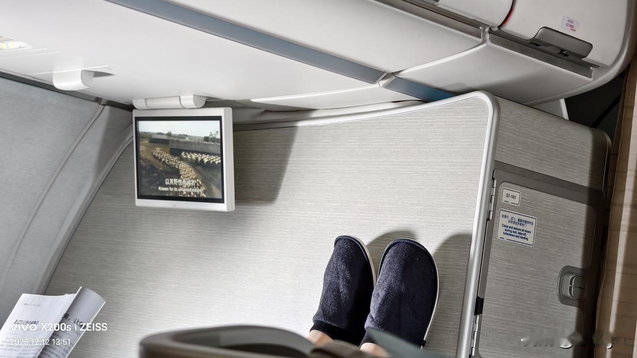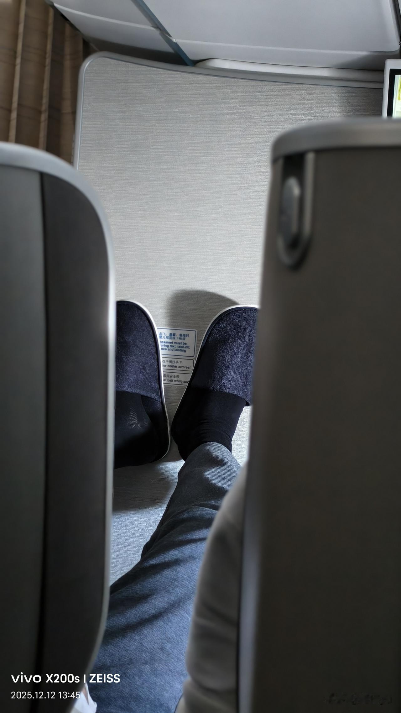 飞机公务舱前壁的两双脚。这样放着自己舒服,但别人看着能舒服吗?两个男士年龄都在30岁左右,其中一个小伙还一直看着机上的《东方航空》杂志,不像没文化;脖子和两个手腕都带着串珠,应该信点什么,他信什么呢?!