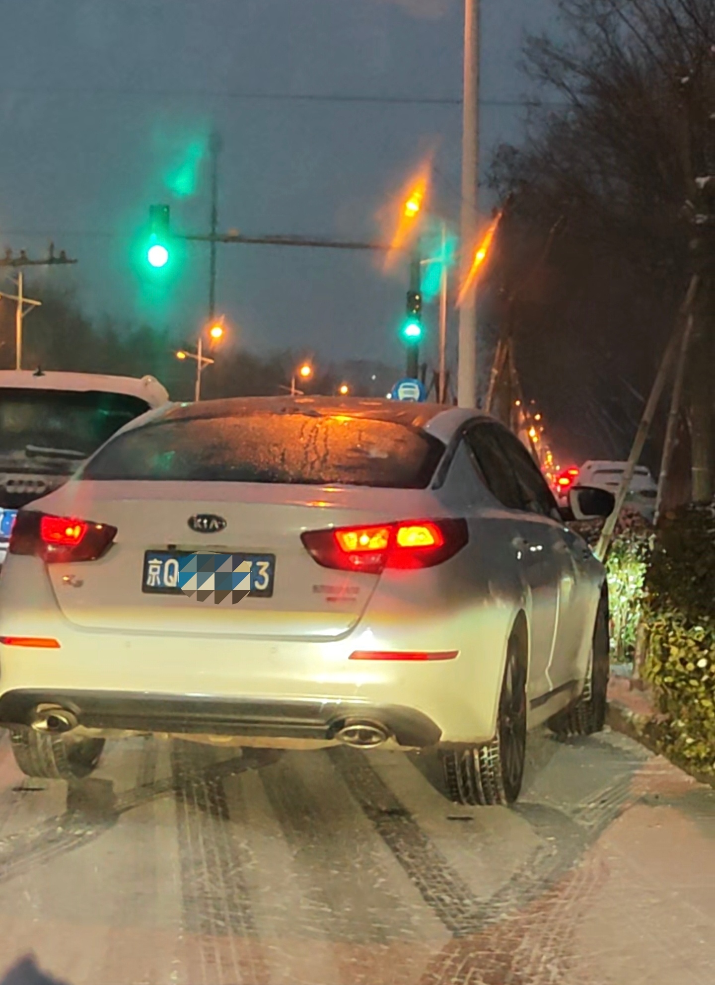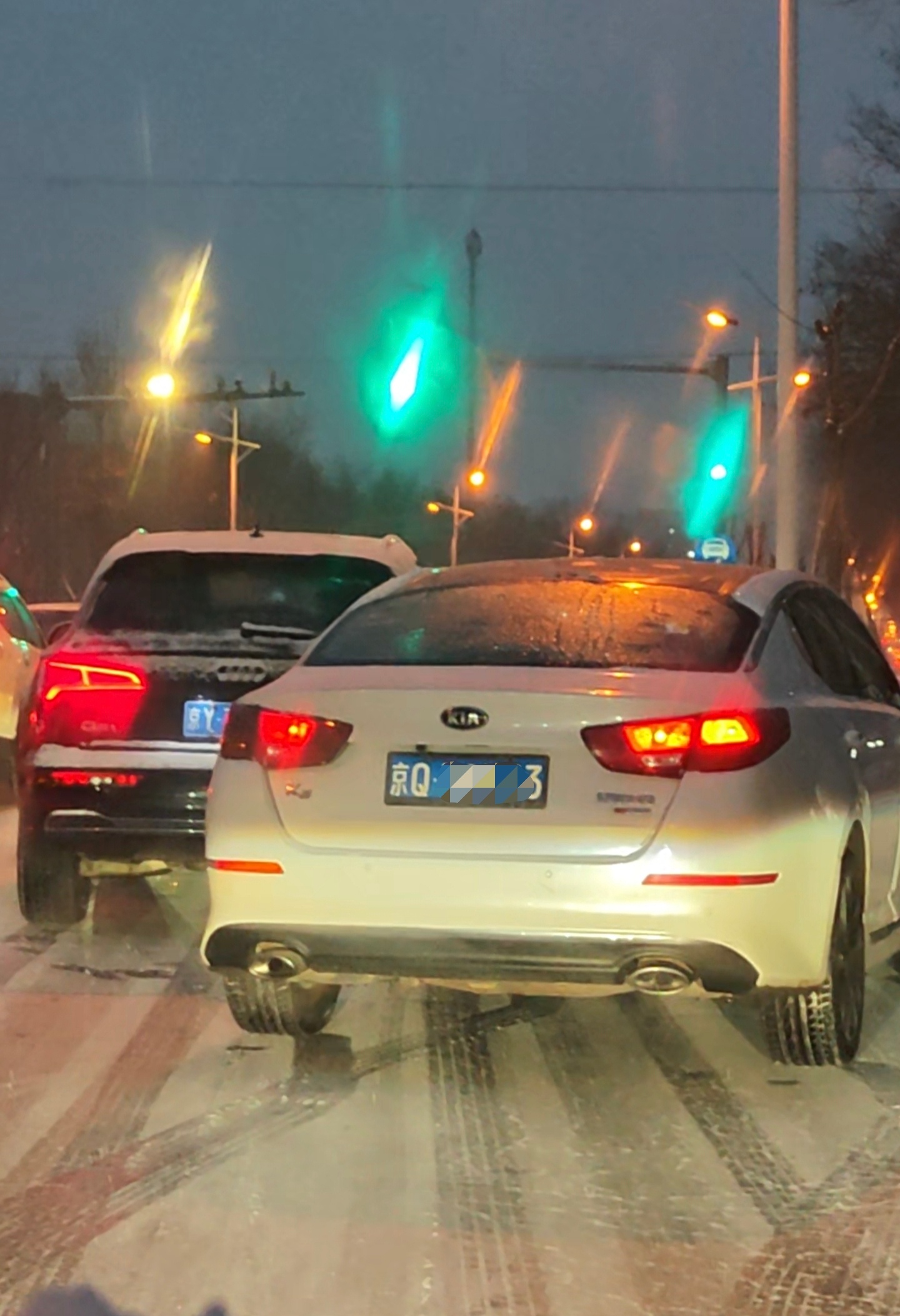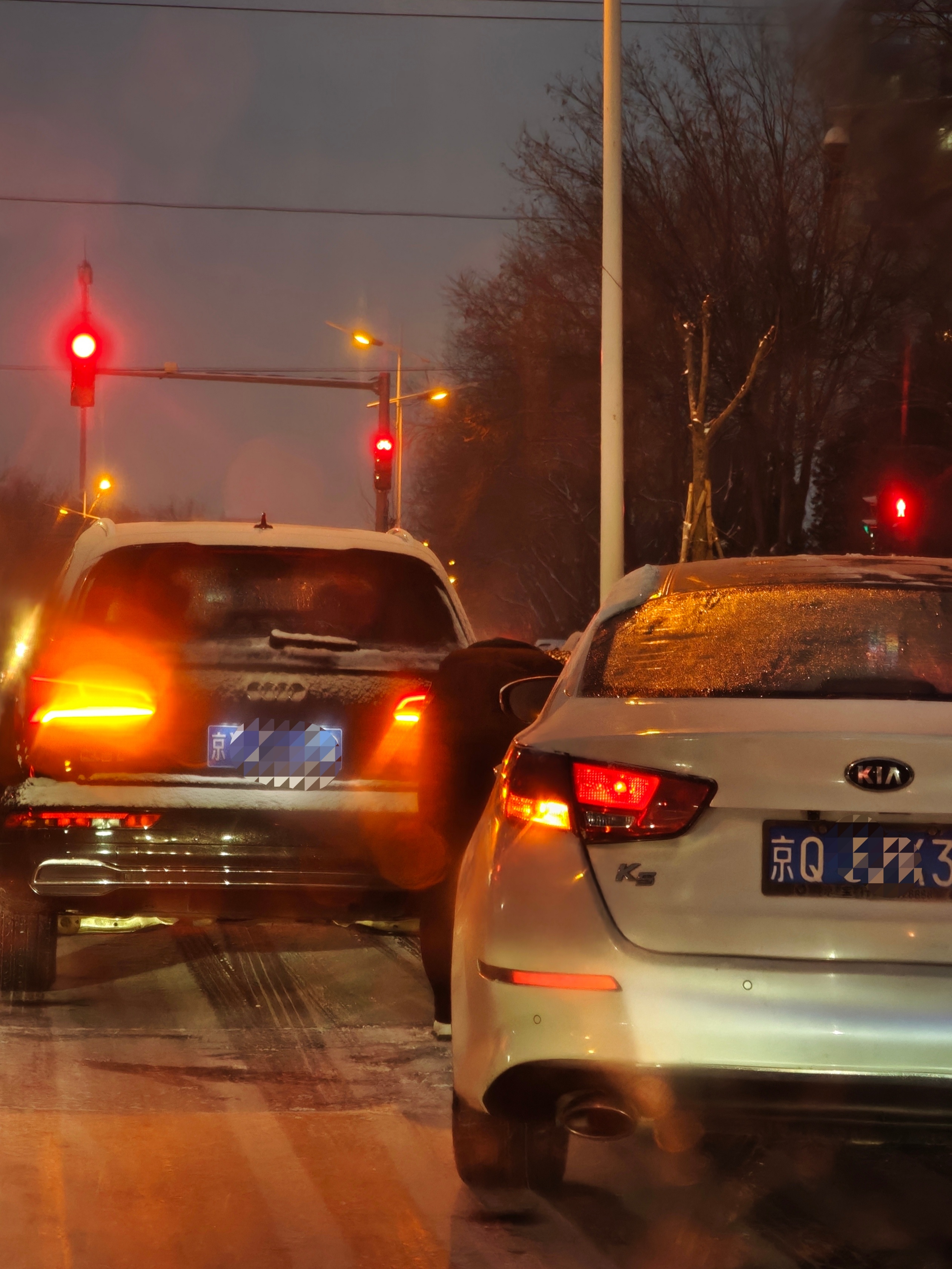 亲眼目睹了一场事故...路面有冰雪,前面这辆起亚刹不住了,调转车头想往马路牙子上偏,但还是撞到了前面的奥迪地上的轮胎印清晰还原了事故现场雪天路滑,大家一定注意安全北京暴雪