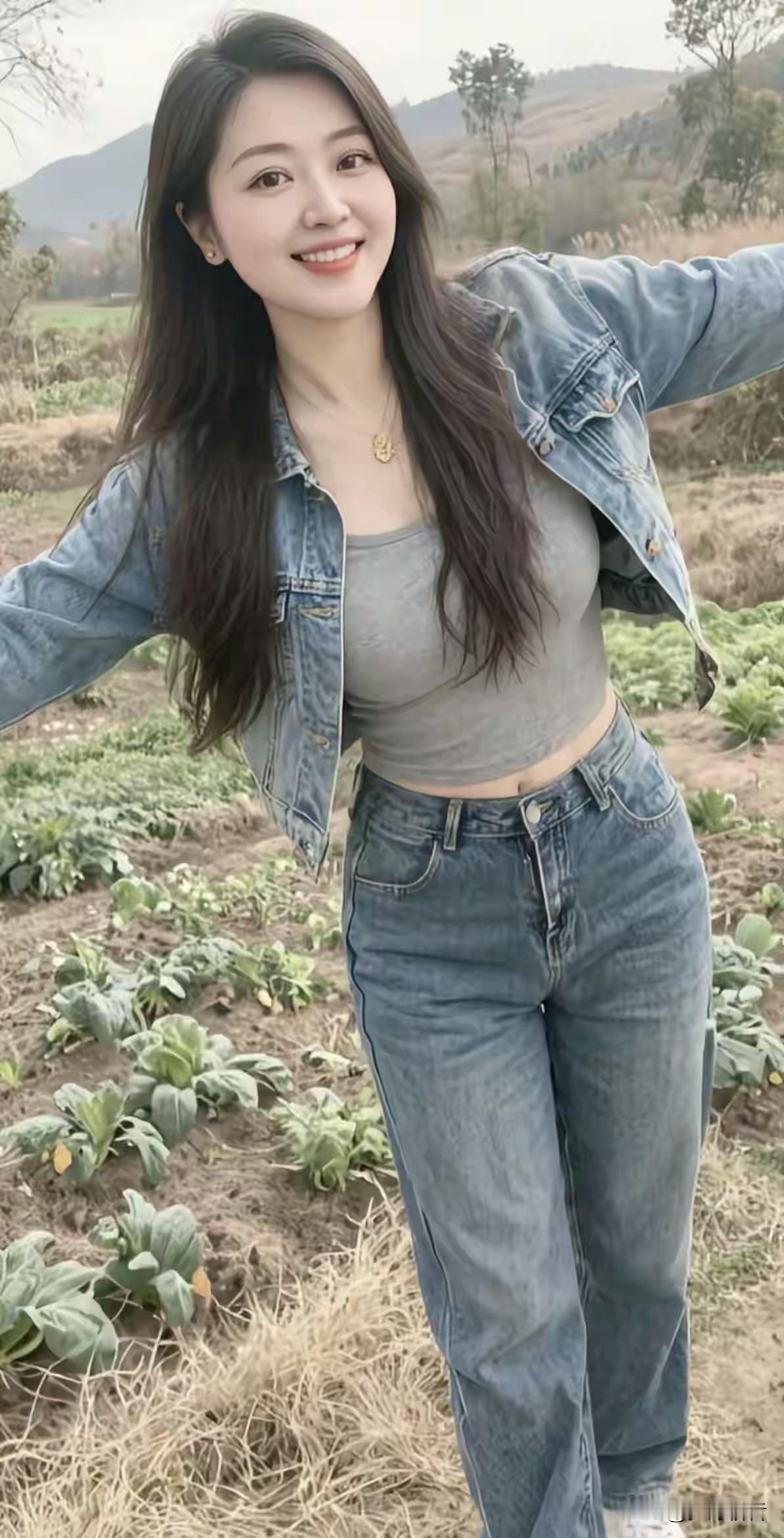 牛仔外套+牛仔裤,笑容甜美,拥抱自然。