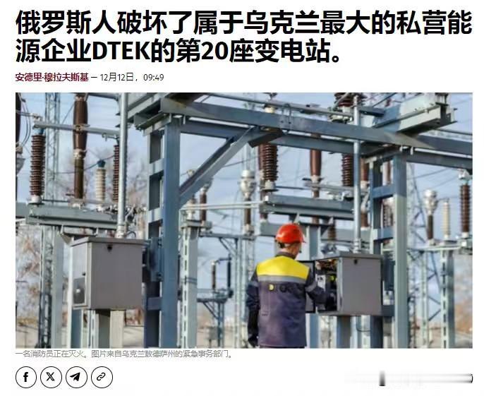 第20座变电站被摧毁——据乌克兰最大私营能源企业发布的报告称,乌克兰在敖德萨的能源设施在12月12日凌晨遭到俄罗斯大规模无人机袭击。这是该企业在乌克兰第20座遭到严重破坏的能源变电站。 报告称,“12日凌晨夜间,俄罗斯联邦袭击了敖德萨州的一座DTEK变电站。这是该州第20座遭到严重破坏的变电站;另外,另一家能源公司的设施也遭到了袭击。” 该企业报告称,他们已经通过备用供电方案为4万户家庭恢复了电力供应,不过仍有9万户家庭暂时处于断电状态。