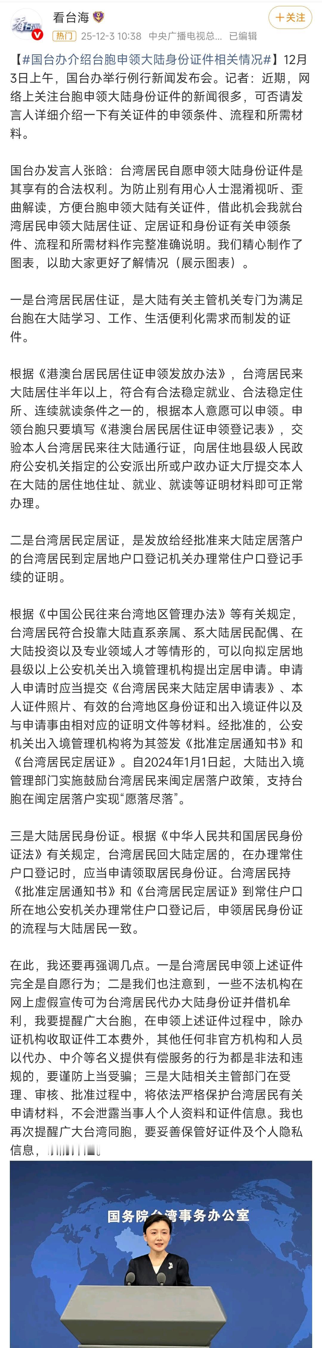 台湾居民可以办大陆身份证了。 台湾居民目前可以申请三种大陆身份证件: 一,台湾居民居住证,相当于以前的台胞证。 二,台湾居民定居证,居住大陆,有工作、有投资、有大陆配偶、投靠大陆直系亲属。以后申请大陆身份证的必要条件。 三,大陆居民身份证,回大陆定居的,持《批准定居通知书》和《台湾居民定居证》,可以办理大陆身份证。 希望下一步是一步到位,给在台湾居住的台湾居民直接办理中华人民共和国台湾省身份证。 拿了身份证的,特别是已在大陆拿了身份证的,到时统一后可以在台湾的原辖区担任组长(社区主任)、村长、乡长等基层职位。 公务员拿了身份证的,统一后可以继续保留原职或升一级。 当兵的拿了身份证的,以后被俘虏了,可以当即释放。抓一个兵,奖一千元。带领一个班起义的,奖五千元。带领一个排起义的,奖1万。带领一个连起义的,奖2万。带领一个营起义的,奖5万。一个团10万,一个旅15万,一个师20万,一个军50万,一个集团军100万。 釜底抽薪!奖励就那么挂着。 在正式统一前,你们的身份证是保密的。我们登岛后,你们全都揭竿而起。到时,现场办理身份证。