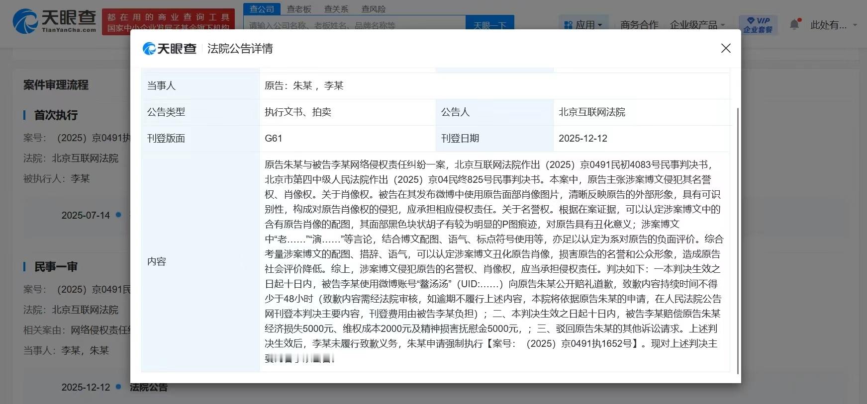 朱一龙朱一龙申请强执黑粉致歉丑化朱一龙黑粉被判赔天眼查法律诉讼信息显示,近日,北京互联网法院公布朱一龙与李某网络侵权责任纠纷一案民事判决书。公告显示,被告在其发布微博中使用原告面部肖像图片,清晰反映原告的外部形象,具有可识别性,构成对原告肖像权的侵犯,其面部黑色块状胡子有较为明显的P图痕迹,对原告具有丑化意义。法院判决李某公开赔礼道歉并赔偿朱一龙经济损失5000元、维权成本2000元及精神损害抚慰金5000元。上述判决生效后,李某未履行致歉义务,朱一龙申请强制执行。