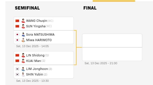 总决赛混双小组赛结束,四强产生,半决赛对阵形势见图。 莎头组合对松岛/美和。 动漫组合对韩林/小申。 期待莎头动漫会师决赛。