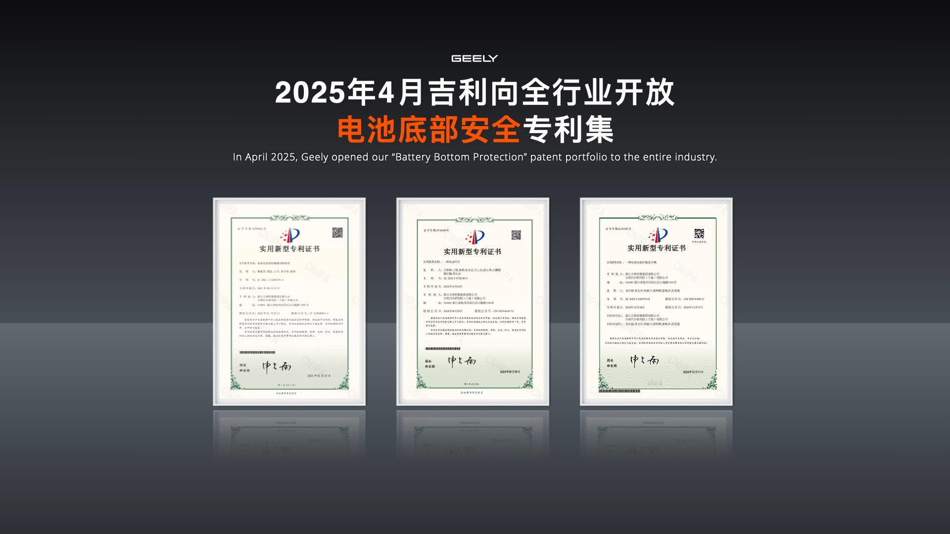 安全就是吉利 安全始终是吉利造车的第一优先级,更向全行业公开相关安全专利2024年8月吉利向全行业开放新能源汽车隐藏式门把手解锁专利集;2024年9月吉利向行业全面开放一键破窗技术;2025年4月吉利向全行业开放电池底部安全专利集。