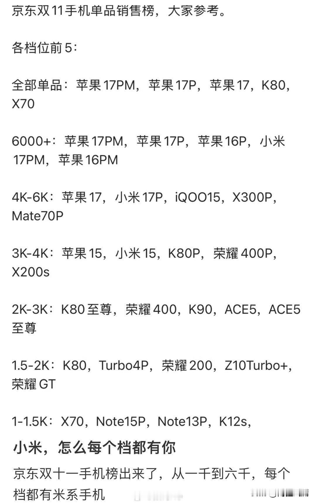 双十一榜单怎么哪哪都有你? 苹果霸榜高端手机?那又如何? 因为他比不过小米呀,无论是高端还是低端,又或者是中端,每一个档位都有小米的身影。 小米手机:从性价比到全生态的手机品牌 小米手机诞生于2011年,是小米集团旗下核心业务板块,以“为发烧而生”为初心,凭借高性价比迅速打开市场,成为国产手机品牌中的重要力量。 早期小米聚焦互联网销售模式,砍掉线下渠道溢价,让旗舰级配置手机以亲民价格面世,比如初代小米1,搭载骁龙8260处理器,售价仅1999元,颠覆了当时手机市场的定价逻辑。如今小米已形成全价位产品矩阵:高端有小米数字系列Ultra/Pro版,主打影像、性能与屏幕技术;中端有Redmi K系列,兼顾性能与性价比;入门级则有Redmi Note、A系列,满足基础使用需求。 技术上,小米持续加码研发,自研澎湃芯片、澎湃快充技术,与徕卡合作打造影像旗舰,折叠屏、屏下摄像等前沿技术也已落地。同时,小米手机深度融合MIUI系统与米家生态,实现跨设备智能联动,从单一手机产品拓展为智能生活入口,目前其市场份额稳居全球前列,成为兼具性价比