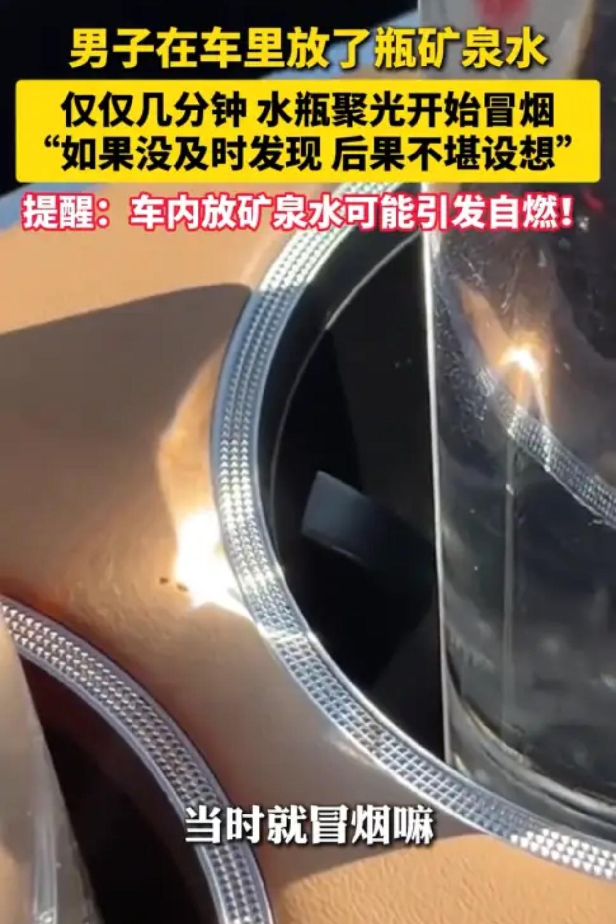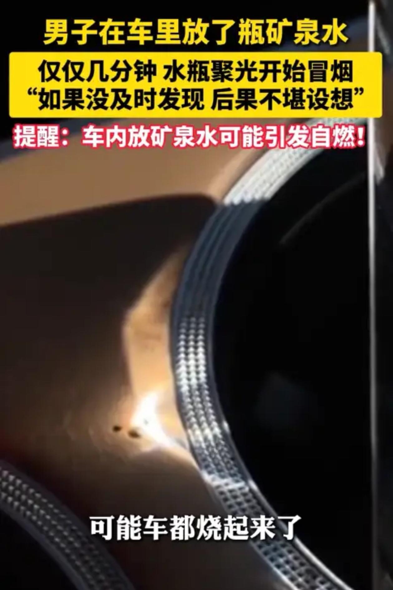 四川有个熊先生,12月11号开车去接朋友,随手把瓶矿泉水放杯架上,也没多想,那天天气好,太阳晒得厉害,水瓶在那儿待着,阳光透过去,光就聚在杯架上,烤着烤着杯架就冒烟了,烤穿了一块。 熊先生开着车闻到味儿不对,低头一看杯架那儿在冒烟,赶紧把水瓶拿开,降温,要是再晚一会儿,车能烧起来,人在车里坐着,车着了,后果想都不敢想。 这事儿听着玄乎,一瓶水能把车烤着,但就是这么回事儿,水瓶圆的,太阳光照进来,瓶子就成了放大镜,光全聚在一个点上,那个点温度高得吓人,杯架是塑料的,扛不住,几分钟就能烤穿,烤穿了接着往下烧,车里那些线路、座椅,都是能着的东西。 熊先生事后自己说,以前从来没想过这茬,水瓶谁不往车里放,喝完就扔那儿,也不收,这回要不是闻到味儿了,真不知道会怎么样,现在想想都后怕。 街坊邻居听说了,有人说这也能着火,有人就说夏天更危险,温度本来就高,水瓶再一聚光,几分钟就能烧起来,不光水瓶,眼镜、打火机这些东西,都得小心放,别往阳光能照到的地方扔。 这事儿像个提醒条,开车的人多留个心眼,车里的东西别乱放,水瓶喝完了收起来,放后备箱或者放遮光的地方,眼镜也一样,能聚光的东西都得注意,别图省事儿随手一扔,出了事儿后悔都来不及。 有人说12月份太阳没那么毒,应该没事儿,熊先生这事儿就摆在那儿,12月照样能把杯架烤穿,夏天那温度更不用说了,车停外头晒着,里头跟蒸笼似的,水瓶往那儿一放,就是定时炸弹。 车主们自己掂量掂量,车里那些瓶瓶罐罐的,该收拾收拾了,别等着冒烟了才想起来,到时候车没了是小事儿,人要是出点啥事儿,一家人都完了。 你们觉得,这种隐患,平时有多少人注意过。