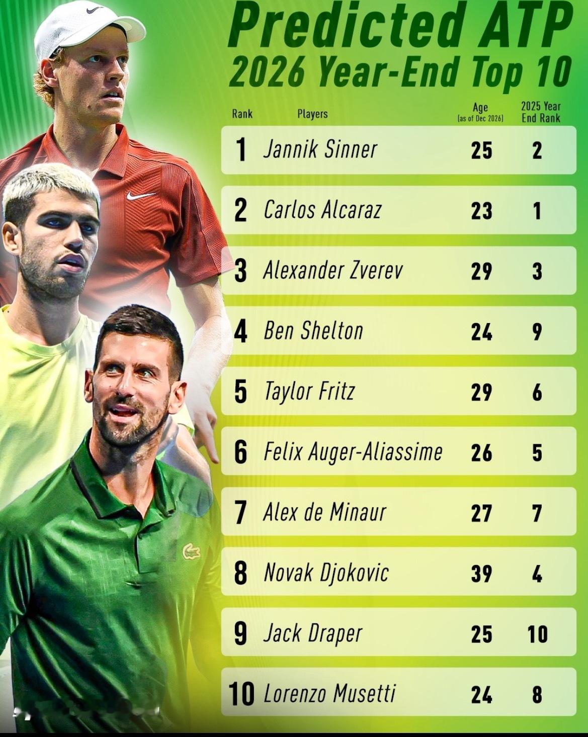 网球talking大会 AI算出的2026赛季男子年终世界排名前十,辛纳重回第一,阿尔卡拉斯第二,德约科维奇第八!