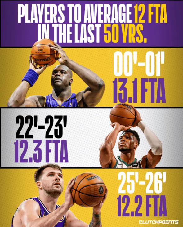 很多人说,亚历山大是造犯规小能手! 可细看一下,这个赛季的东契奇居然入选了近50年来场均至少12次罚球出手的球员。 在他前面,还有两个人,一个叫奥尼尔,2000-2001赛季,场均13.1次。位列第一。 第二个字母哥,2022-2023赛季,场均12.3次。 这两个都能理解,在低位,奥尼尔要打,对手只能犯规。 字母哥一旦冲起来,那也只能犯规。 完全是被动的。 可东契奇一个后卫,一个1号位,居然,也在这份榜单上,这赛季,他场均12.2次。 完全可以理解为,他是主动要犯规的,反正,裁判你不给,我就大喊,尖叫,一哭二闹三上吊。
