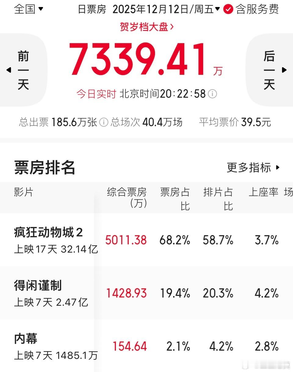 今天,《疯狂动物城2》继续倒挂,已经连续三天倒挂了。而《得闲谨制》则接着正挂,已