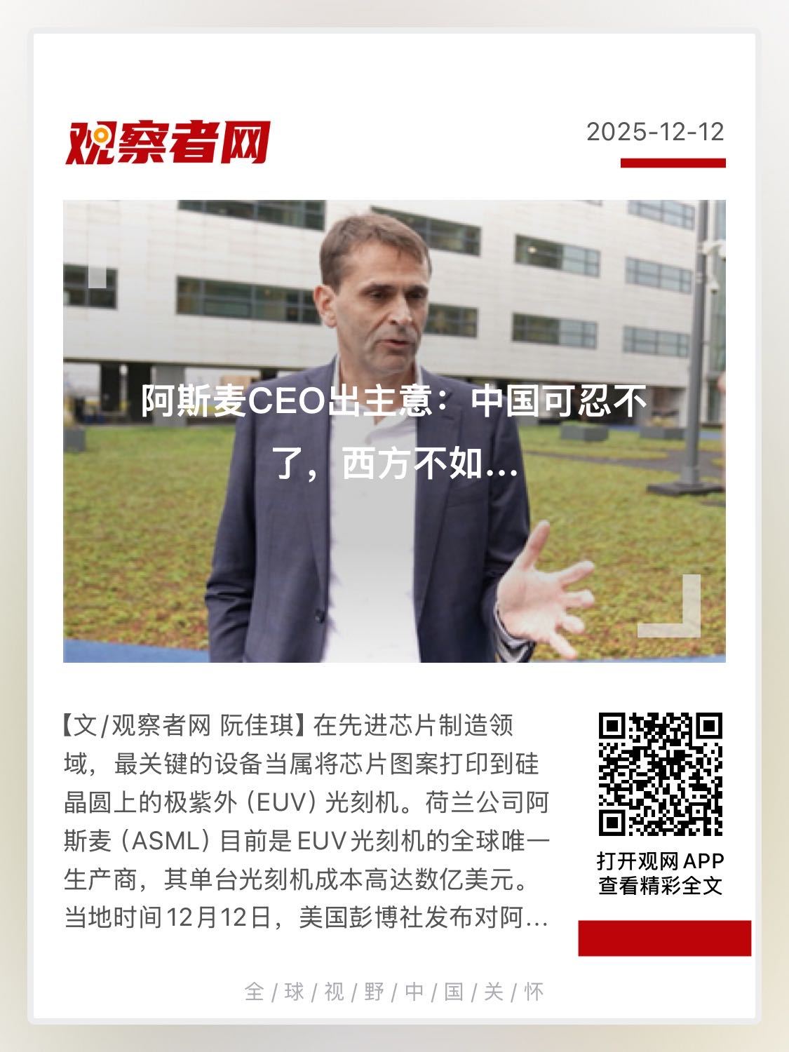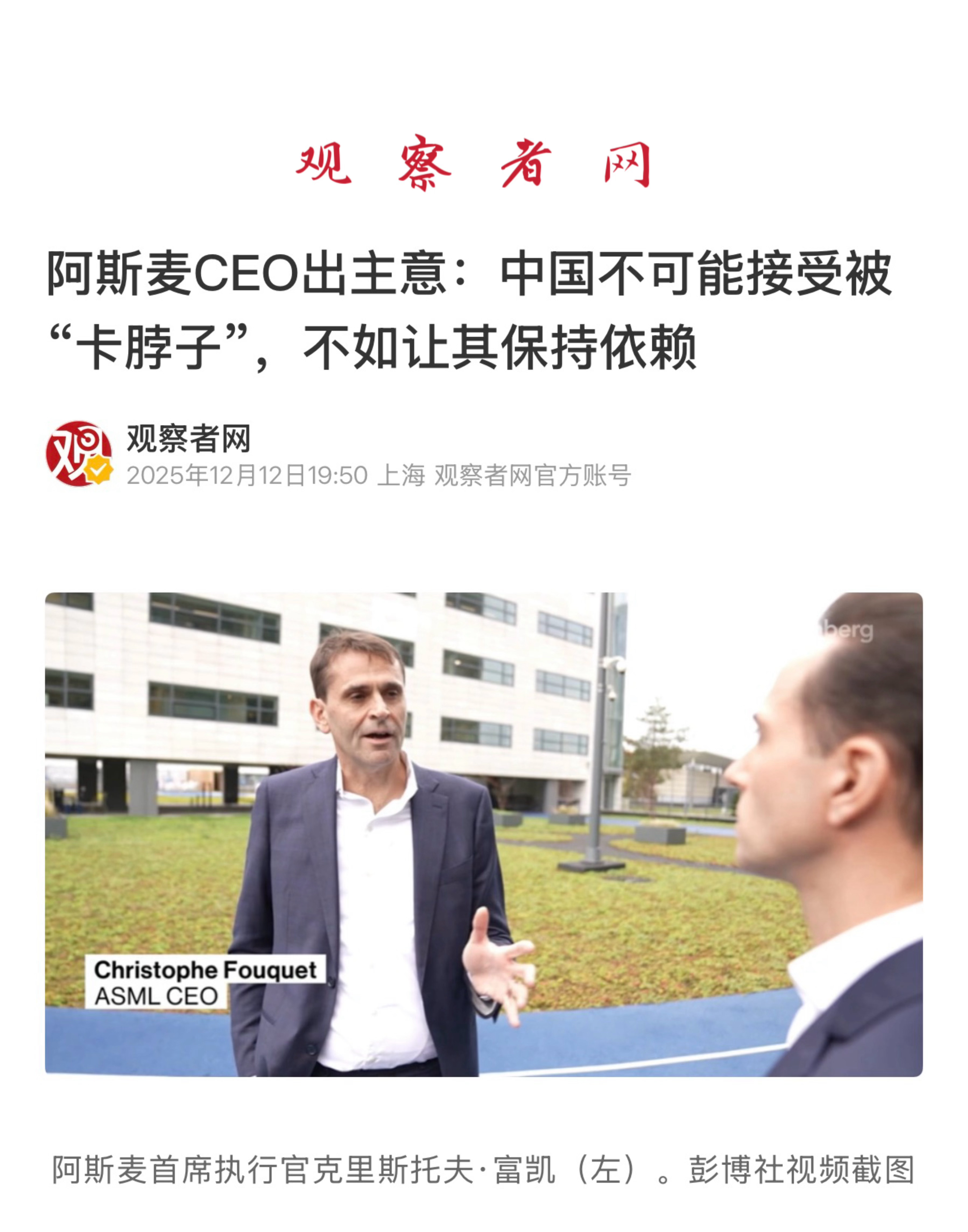 观察者网独家稿件 【阿斯麦CEO出主意:中国不可能接受被“卡脖子”,不如让其保持依赖】 (观察者网 2025-12-12 19:50:53 ) 在先进芯片制造领域,最关键的设备当属将芯片图案打印到硅晶圆上的极紫外(EUV)光刻机。荷兰公司阿斯麦(ASML)目前是EUV光刻机的全球唯一生产商,其单台光刻机成本高达数亿美元。 当地时间12月12日,美国彭博社发布对阿斯麦首席执行官克里斯托夫·富凯(Christophe Fouquet)的专访。报道指出,阿斯麦虽受益于AI热潮带动的半导体行业发展,业绩持续走高,但除了要应对市场波动与投资不确定性,还需直面复杂地缘政治环境带来的多重挑战。 近年来,美国持续向荷兰施压,要求限制阿斯麦对华出售先进芯片制造设备。报道提到,随着大力发展本土芯片产业,中国大陆已于去年成为阿斯麦的最大市场。然而受美方禁令影响,阿斯麦如今被禁止向中国出口所有EUV设备及最先进的深紫外(DUV)光刻设备。 在专访中,去年接任CEO一职的富凯重申其观点,即“应向中国适度输出技术以防其自主研发形成竞争力”。他进一步宣称,在对华技术出口限制问题上,西方需要找到一个微妙的平衡点。 “中国绝不会接受在技术方面被‘卡脖子’的处境,”他解释道,“如果你是一个拥有14亿人口的大国,就必然要谋求技术进步,这是不争的事实。” 富凯出主意称,西方可以通过拒绝向中国提供“最新和最好的产品”,以维持中方对西方技术的依赖,同时拖慢中国自主技术进步的速度。 据他透露,目前阿斯麦对华出口的设备,比最新的高数值孔径光刻技术整整落后了八代,技术水平相当于该公司2013、2014年销往西方客户的产品,技术差距超过十年。 “但问题的关键在于,我们要把这种技术差距拉大到何种程度?是让中国落后5年、10年,还是15年?”富凯继而担忧称,如果西方过度收紧限制,将中国逼至绝境,迫使中方别无选择、只能彻底摆脱对西方技术的依赖,反而会倒逼中国决心自主研发替代产品。从长远来看,这将导致西方彻底失去这一庞大市场。 “中国已经在很多领域实现自主研发了,假以时日,他们甚至可能反过来向我们出口这些产品。”他补充道。 富凯声称,关键争论点不该是“是否要对华限制”,而是思考“西方希望中国落后到何种程度”。他宣称,西方必须在“遏制手段、技术代差”和“由此引发的后果”之间,找到一个所谓“恰当”的平衡点。 彭博社在报道中指出,尽管目前阿斯麦在光刻领域占据垄断地位,但其未来发展仍面临挑战。举例而言,中国上海微电子装备的设备虽比阿斯麦落后10至15年,但该公司正在政府支持下大力追赶光刻技术;硅谷风投大佬彼得·蒂尔(Peter Thiel)支持的旧金山初创企业Substrate,也计划利用新型激光技术挑战阿斯麦的市场地位,只是其技术距离量产仍需数年时间。 采访接近尾声时,富凯仍对自身技术优势抱有信心。他乐观表示,“光刻技术仍然很难被完全替代……而且整个生态系统的关联性极强。这不仅关乎光刻技术本身,还涉及我们的光刻设备如何融入客户的整个生产流程。” 富凯的判断中,至少有一点是完全正确的:中国绝不会停下追求技术突破的脚步。 法国《世界报》10月曾刊文指出,面对光刻技术瓶颈,中国企业正加倍努力实现自给自足。在国家战略支持下,中国企业已制定宏伟目标,计划到2030年掌控全球近三分之一的晶圆代工产能。 报道强调,这是中国“以自主技术突破西方封锁”的又一次重要尝试。有分析师告诉法媒,中国国内已形成普遍共识——无论面临多少阻碍,加速推进技术突破的目标坚定不移。 “封锁成为了中国企业的兴奋剂。”有法媒总结该文章论点称,来自美西方的技术封锁反倒激发了中国更强烈的自主欲望,“整个中国,现在都在以一种‘你封我,我就自己造’的精神前行着。” 2024年1月,中方曾就美国强推“光刻机禁令”严正表态称,中方一贯反对美国泛化国家安全概念,以各种借口胁迫其他国家搞对华科技封锁。半导体是高度全球化的产业,在各国经济深度融合的背景下,美方有关霸道、霸凌行径严重违背国际贸易规则,严重破坏全球半导体产业格局,严重冲击国际产业链、供应链的安全和稳定,必将自食其果。 中方同时敦促荷方秉持客观公正立场和市场原则,尊重契约精神,以实际行动维护中荷两国和双方企业的共同利益,维护国际产业链、供应链的稳定和自由、开放、公正、非歧视的国际贸易环境。 * 本文系观察者网独家稿件 阿斯麦CEO出主意:中国可忍不了,西方不如…