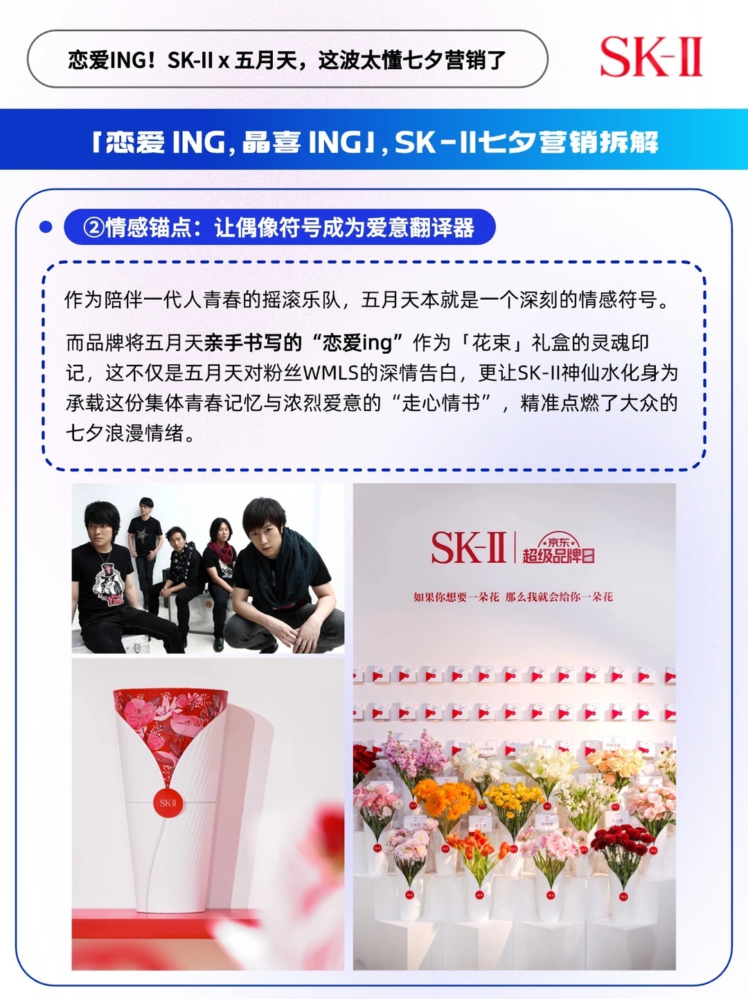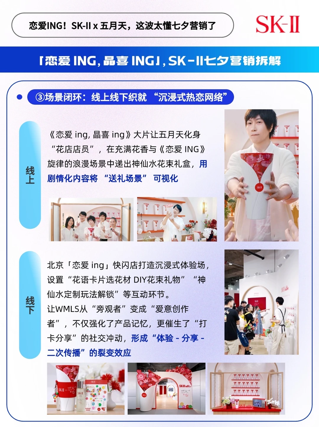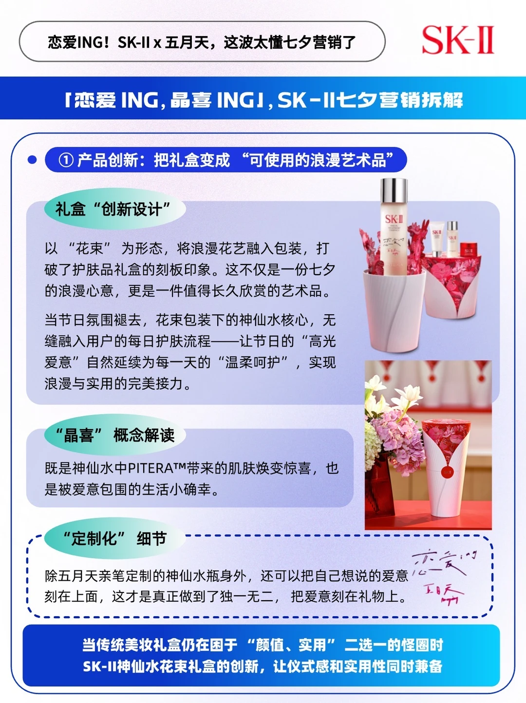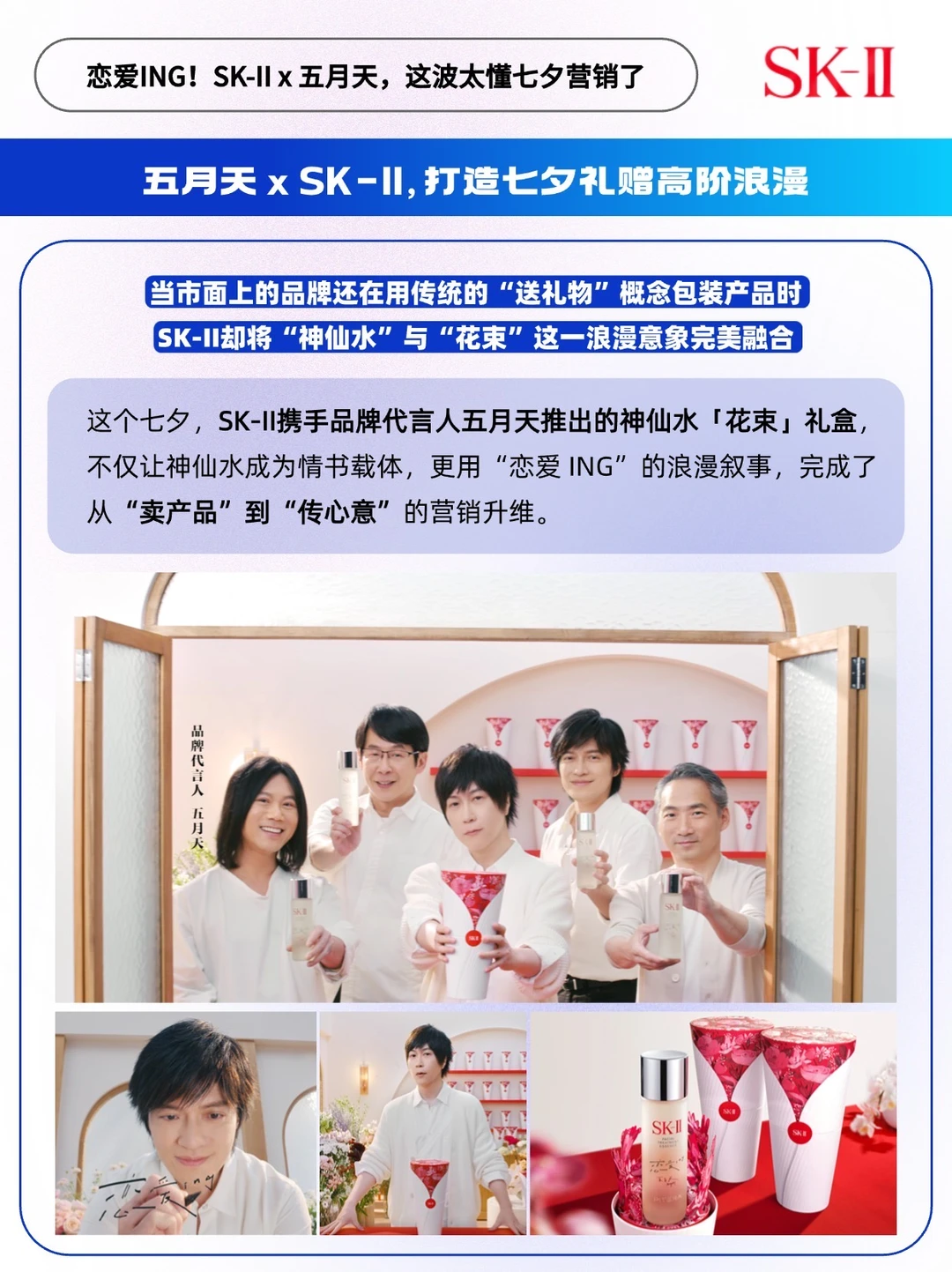 - 七夕营销年年卷, 今年SK-II却用一束「不会凋谢的花」杀出了重围。 🔵当多数品牌还在堆玫瑰、写情话时,它带着创新设计的「花束」礼盒,直接跳出「节日限定=一次性浪漫」的套路,把七夕的浪漫从24小时的仪式感,变成了365天的日常「晶喜」。这波操作,真的有点超乎意料了。 ✅在洞察上: 戳中当代人「浪漫刚需」,爱意要「看得见,用得到」 比起七夕当天的惊喜,更怕节日过了,仪式感就散了。 SK-II 精准踩中这个痛点,把「七夕送礼」和「日常护肤」绑在了一起。瓶身印着五月天亲笔写的「恋爱ing」,每次护肤时看到这行字,都像是在被宠爱、值得欢欣的「恋爱 ING」状态~ ✅在产品设计上: 藏着「小巧思」,仪式感和实用性一个不落 🌹创新高颜值:把礼盒做成「花束」形态。七夕送花是浪漫标配,它把花艺元素融进包装,仪式感拉满,还不用担心凋谢。 🫧实用性:SK-II 的王牌单品神仙水,90%以上都是PITERA™成分,保湿、抗老、提亮样样行。拿得出手,送礼也倍有心意。 ✅在传播上: 全场景沉浸式的传播闭环 营销想破圈,光有好产品不够,还得让用户看得懂、能参与、愿分享。 作为陪伴一代人青春的摇滚乐队,五月天不仅亲自出演SK-II的《恋爱ing, 晶喜ing》七夕浪漫大片,更把对粉丝的浪漫承诺搬进了现实: 曾经说过“我用情歌开一家花店”的阿信,这次真的和SK-II一起把「情歌花店」变成了片中场景: 他们在花香萦绕的店里递出礼盒,背景音乐循环着国民级爱情BGM《恋爱 ING》,每帧画面都藏着「双向奔赴」的温柔。这种带着粉丝记忆的场景化剧情,比硬广更能戳中人心❤️ 同时,SK-II还把片中五月天的同款场景“搬到”了北京的线下「恋爱 ing」快闪店,大家可以自己选择花材 DIY,解锁更多神仙水定制玩法。这种亲手定制的浪漫,谁能忍住不拍照发个圈炫耀呢?[得意R] 写到最后不得不感慨一句,SK-II确实太懂七夕营销了,毕竟,能时刻留在日常里的浪漫,才是最为戳心的~[赞R]