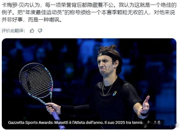 你们怎么看?意大利记者认为,每一项荣誉背后都隐藏着不公。“我认为这就是一个绝佳的例子。把“年度最佳运动员”的称号颁给一个本赛季颗粒无收的人(穆塞蒂),对他来说并非好事,而是一种嘲讽。”网坛风云
