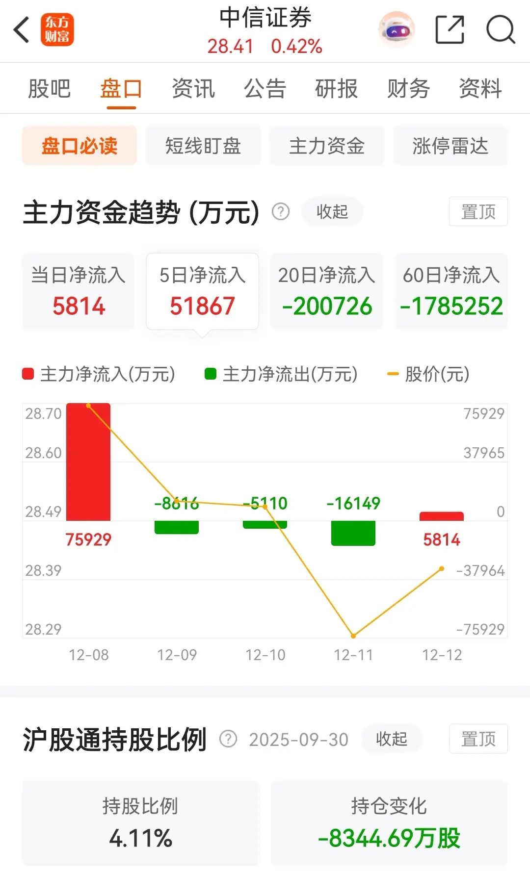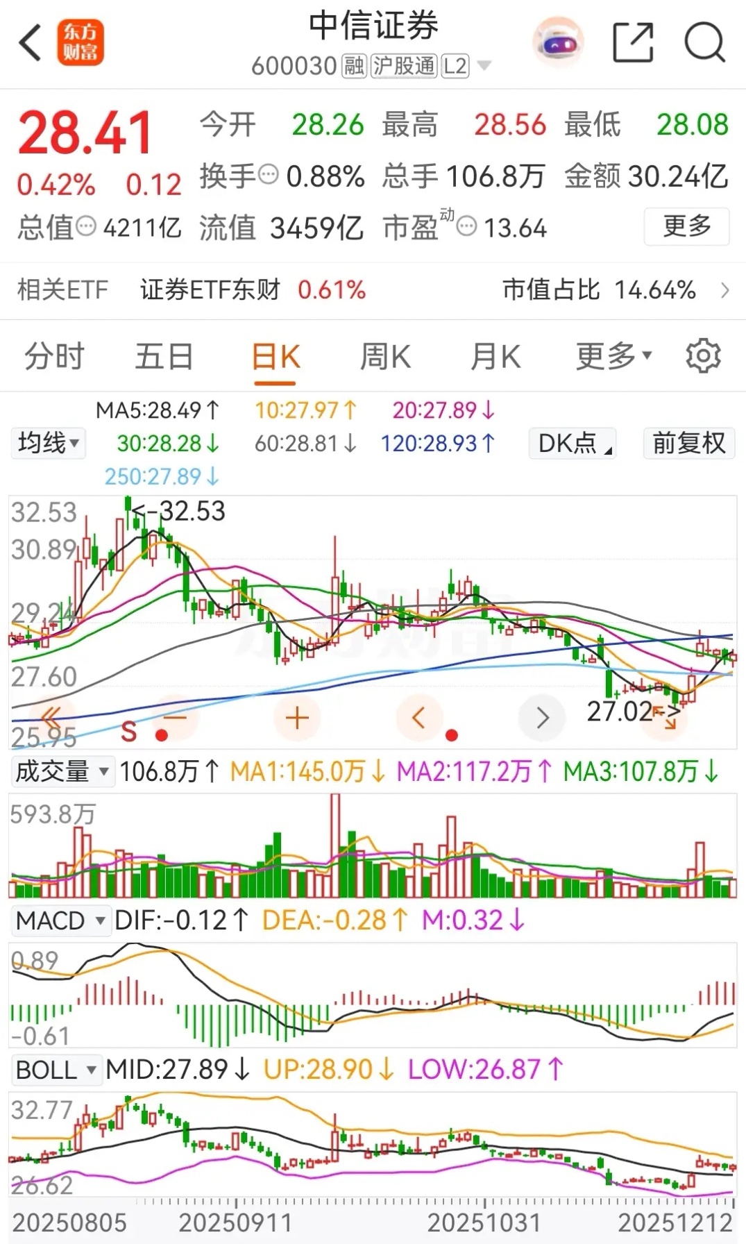 东方财富和中信证券今天双双上涨,且都被主力资金净买入。东方财富今天早盘高开后冲高回落,上涨了 0.79%,收盘报价为 23.02 元,全天的成交金额为52.11亿元,小幅放量。在资金流向上,今天被主力资金小幅净买入了0.7677亿元,近五个交易日则是合计被净卖出了14.0693亿元。中信证券今天低开后震荡走高,收盘时上涨了0.42%,收盘报价为28.41元。全天的成交金额为 30.24 亿元,属于小幅放量。在资金流向上,主力资金今天净买入了0.5814亿元,本周则是合计净买入了5.1867亿元。至于技术面分析,请查看上一篇中关于券商概念板块走势的分析。估值与股东结构:目前东方财富PE约37倍,显著高于行业平均20倍,股东人数超101万,散户集中,波动大;中信证券PE仅17.58倍,股息率2.6%,机构持仓稳定,股东66.90万人,更具防御性。在股价走势上,两者年内涨幅均为负,处于空头趋势;东财受高估值与资金持续净卖出压制,中信则被疑为主力调控指数工具。