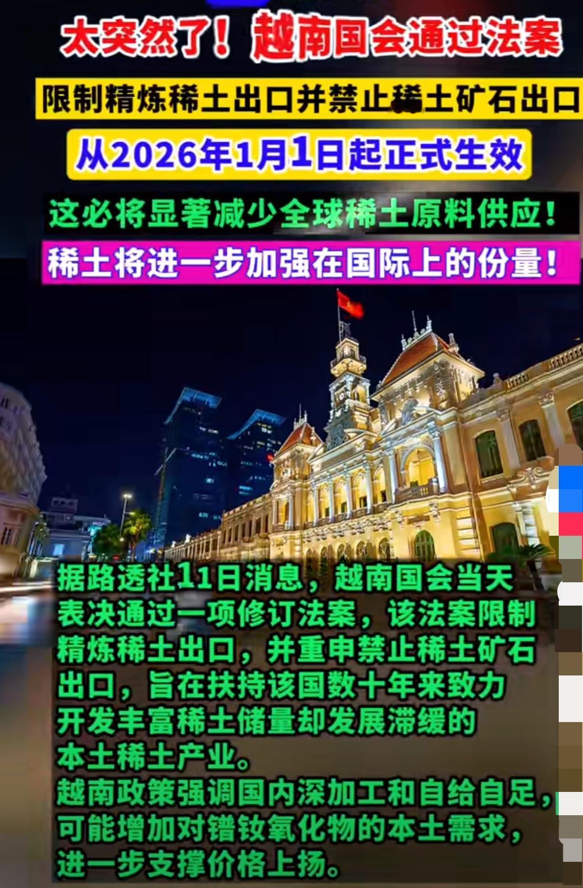 越南突然发布稀土禁令,生出了取代中国的野心? 2026年1月1日起,越南将全面封禁稀土原矿出口,连精炼产品也纳入管控,这纸突然落地的禁令,瞬间搅动全球资源市场。 难道这个常年靠出口原料获利的国家,真要跳出低端供应链,觊觎中国垄断近90%的稀土话语权?这场看似野心勃勃的布局,实则藏着发展中国家产业升级的必然选择与无奈博弈。 禁令不是冲动:从“卖石头”到“造精品”的破局尝试 越南此次修法绝非临时起意,而是对2021年漏洞百出的禁令进行彻底升级。此前部分企业靠“贴牌初级加工”规避监管,2024年上半年仍有1.37亿美元原料流向亚洲市场。 新法直接将稀土列为国家特殊战略资源,勘探、加工全由政府统筹,还明确鼓励国际技术合作,核心就是倒逼本土产业摆脱“资源出口国”的低端标签。要知道,稀土原矿每吨利润仅数千美元,加工成永磁体后价格能飙至20万美元,这种价值差距,正是越南想要跨越的鸿沟。 野心照进现实:三重桎梏下的“有矿难炼”困境 美国地质调查局2025年数据显示,越南稀土储量350万吨居全球第六,但含金量远不如预期。80%都是应用场景有限的轻稀土,高端制造急需的重稀土占比极低,且九成矿藏未完成精准勘探。 更致命的是技术鸿沟,中国已实现99.99%高纯度提炼,越南现有工艺纯度不足90%,核心的离子吸附、串级萃取技术完全空白。加上中国对提炼设备的出口禁令,越南想自主研发,至少需要20年周期和百亿级资金投入。 产能差距更是悬殊,2024年越南稀土年产量仅600吨,而中国单国年产量就达16万吨,全球年需求量已突破十万吨量级。这种“千吨级”对“十万吨级”的差距,让越南短期内难以撼动现有格局。 格局未变:互补而非替代的全球稀土新生态 看似针对中国的禁令,实则短期内对全球市场影响微乎其微。越南原矿出口占全球比重不足0.5%,依赖其原料的企业可快速转向澳大利亚、加拿大等替代来源。 反而形成了“越南有矿、中国有技”的互补格局,2025年越南已成为中国稀土金属第五大买家,进口量同比增长两倍多。中国掌控的全产业链闭环与技术壁垒,让全球稀土“中国核心、多极补充”的格局进一步巩固。 越南的稀土禁令,本质是发展中国家追求产业升级的勇敢尝试,而非单纯的“取代野心”。资源的价值从来不在储量多少,而在转化能力的高低。 当更多国家开始重视产业链自主,全球稀土市场的竞争将从资源争夺转向技术创新,这种良性博弈,或许会推动行业更健康的发展。而越南能否跨越技术与产能的鸿沟,真正从“资源大国”走向“产业强国”,时间会给出最公正的答案。