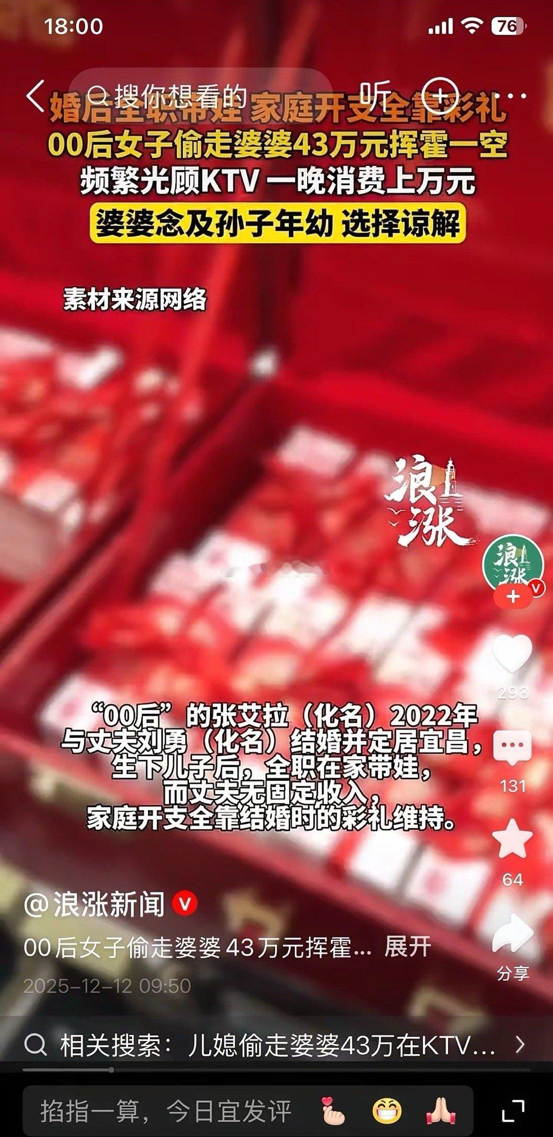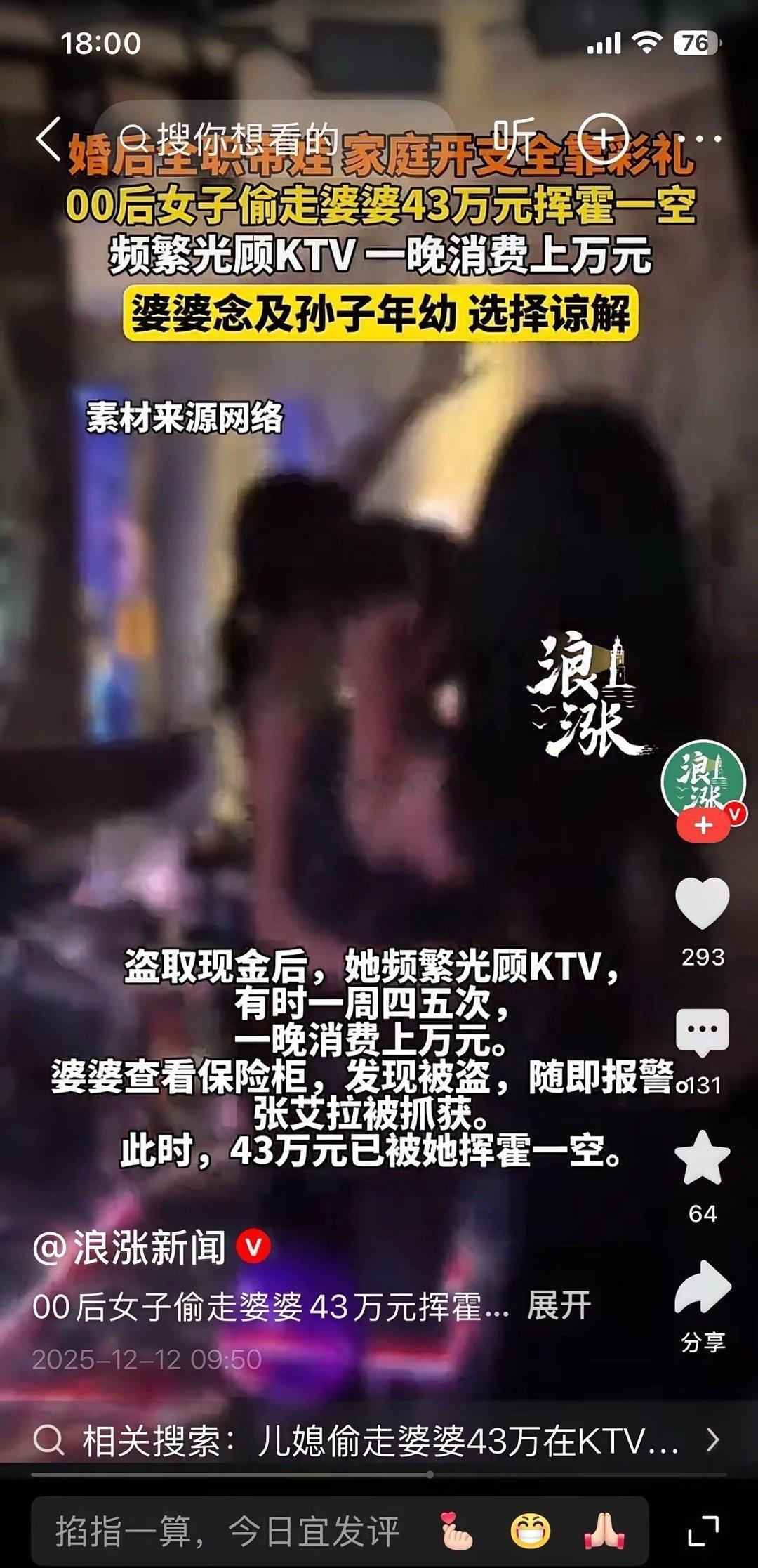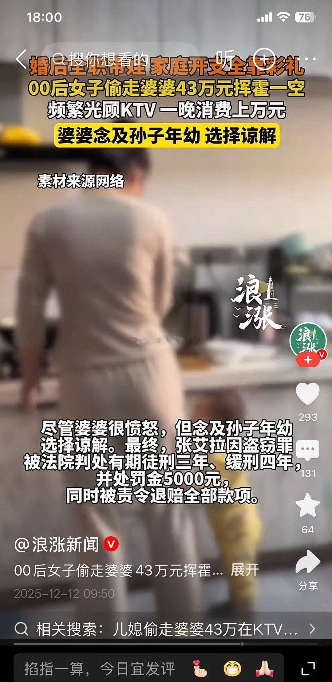 00后儿媳妇偷走婆婆43万元,并挥霍一空,经常在KTV一晚消费上万元,虽然最后获得婆婆谅解,但还是被判刑4年!12月12日,据湖北宜昌媒体报道:一名00后儿媳妇偷走婆婆43万元并挥霍一空,女子频繁光顾KTV,一晚上消费就上万元。虽然婆婆念及孙子年幼,选择原谅,但女子依然被判处4年有期徒刑!