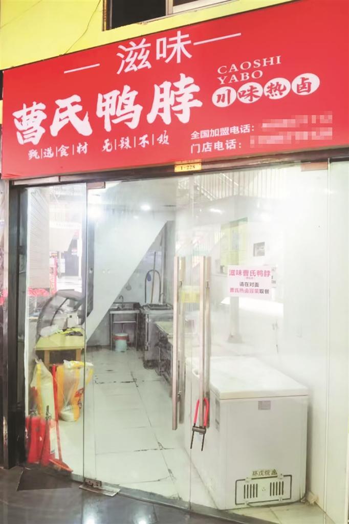 在某外卖平台搜索“曹氏鸭脖”(花果园店),会出现“滋味曹氏鸭脖(花果园店)”和“曹氏热卤冒菜(花果园店)”两家店铺。记者按照其中一家地址到访,发现“滋味曹氏鸭脖”的门店玻璃上贴着“滋味曹氏鸭脖请在对面曹氏热卤冒菜取餐”的提示。