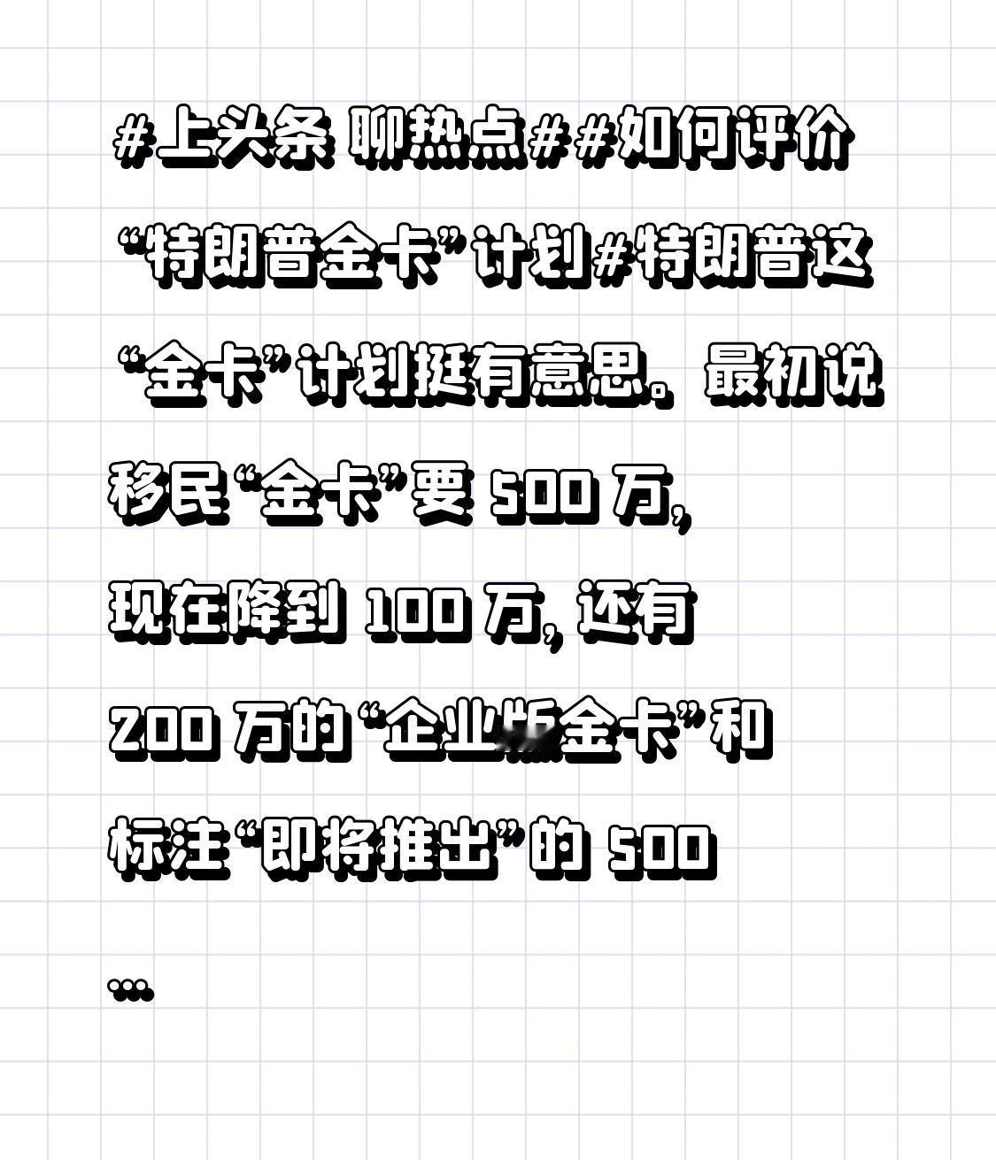 如何评价“特朗普金卡”计划 特朗普这“金卡”计划挺有意思。最初说移民“金卡”要 500 万,现在降到 100 万,还有 200 万的“企业版金卡”和标注“即将推出”的 500 万“铂金卡”。个人申请要付 100 万和 1.5 万的处理审查费,企业版也有相应费用,获批后每年还得交 1%维护费。 特朗普曾幻想卖 1000 万张卡还清国债还多赚 15 万亿美元,可专家不咋看好。这计划 9 月行政命令设立,没经国会批准,其法律效力和能否融入现有移民系统存疑,对美国财政的帮助也值得商榷。感觉这就像一场不太靠谱的生意。 抛开法律和财政层面,“特朗普金卡”计划在社会层面也会带来诸多问题。对于美国本土民众而言,大批通过“金卡”涌入的新移民,可能会对就业市场造成冲击,尤其是一些基层岗位。而且不同文化背景的人群大量进入,若处理不当,可能会引发文化冲突和社会矛盾。 从国际视角看,这无疑是把移民政策变成了赤裸裸的商品交易。其他国家可能会质疑美国的移民理念和价值观,使得美国在国际形象上大打折扣。而且这种“金钱至上”的移民方式,可能会吸引一些不法分子通过不正当手段获取资金来购买“金卡”,从而给美国的社会治安埋下隐患。 再者,即便真的有人申请“金卡”,后续这些新移民的融入也是个大问题。他们可能仅仅因为金钱而来到美国,对美国的社会制度、文化传统缺乏认同感和归属感,这对于美国的长期社会稳定也并非好事。特朗普这一“脑洞大开”的计划,很可能是“赔了夫人又折兵”,不但无法实现他那不切实际的经济幻想,还会给美国带来一连串新的麻烦。