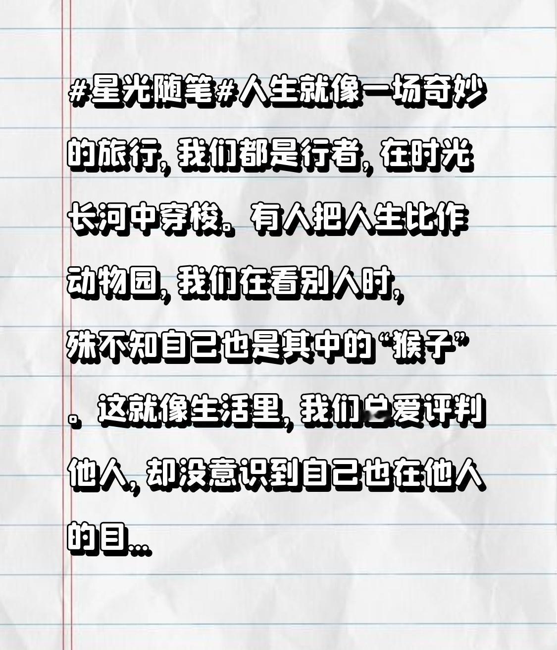 人生就像一场奇妙的旅行,我们都是行者,在时光长河中穿梭。 有人把人生比作动物园,我们在看别人时,殊不知自己也是其中的“猴子”。这就像生活里,我们总爱评判他人,却没意识到自己也在他人的目光里。 也有人说人生如爬山,有人一心奔终点,忽略了沿途风景。就像很多人拼命追逐功名利禄,却错过了生活的小确幸。 人生是一本书,封面和封底既定,内容得靠自己书写。无论精彩还是平淡,都是属于自己独一无二的故事。 其实,人生还似一场棋局,每一步选择都至关重要。有的人步步为营,谨慎落子,虽走得慢些,却稳扎稳打;而有的人则冲动冒进,随意出招,最后满盘皆输。在这场棋局里,我们既是棋手,也是棋子,既要掌控全局,又要在既定规则中寻找生机。 人生亦如一场音乐会,有激昂的高潮,也有舒缓的乐章。当激昂时,我们畅快淋漓地释放自我;当舒缓时,我们静静地沉淀心灵。每一个音符都是生活的瞬间,或喜或悲,或苦或甜,共同交织成一曲动人的旋律。 不管人生以何种形式呈现,我们都应珍惜这趟旅程。用心去感受每一处风景,认真书写每一页篇章,谨慎走好每一步棋,用心聆听每一个音符。如此,当我们回首往事,才不会因虚度而悔恨,因错过而遗憾。