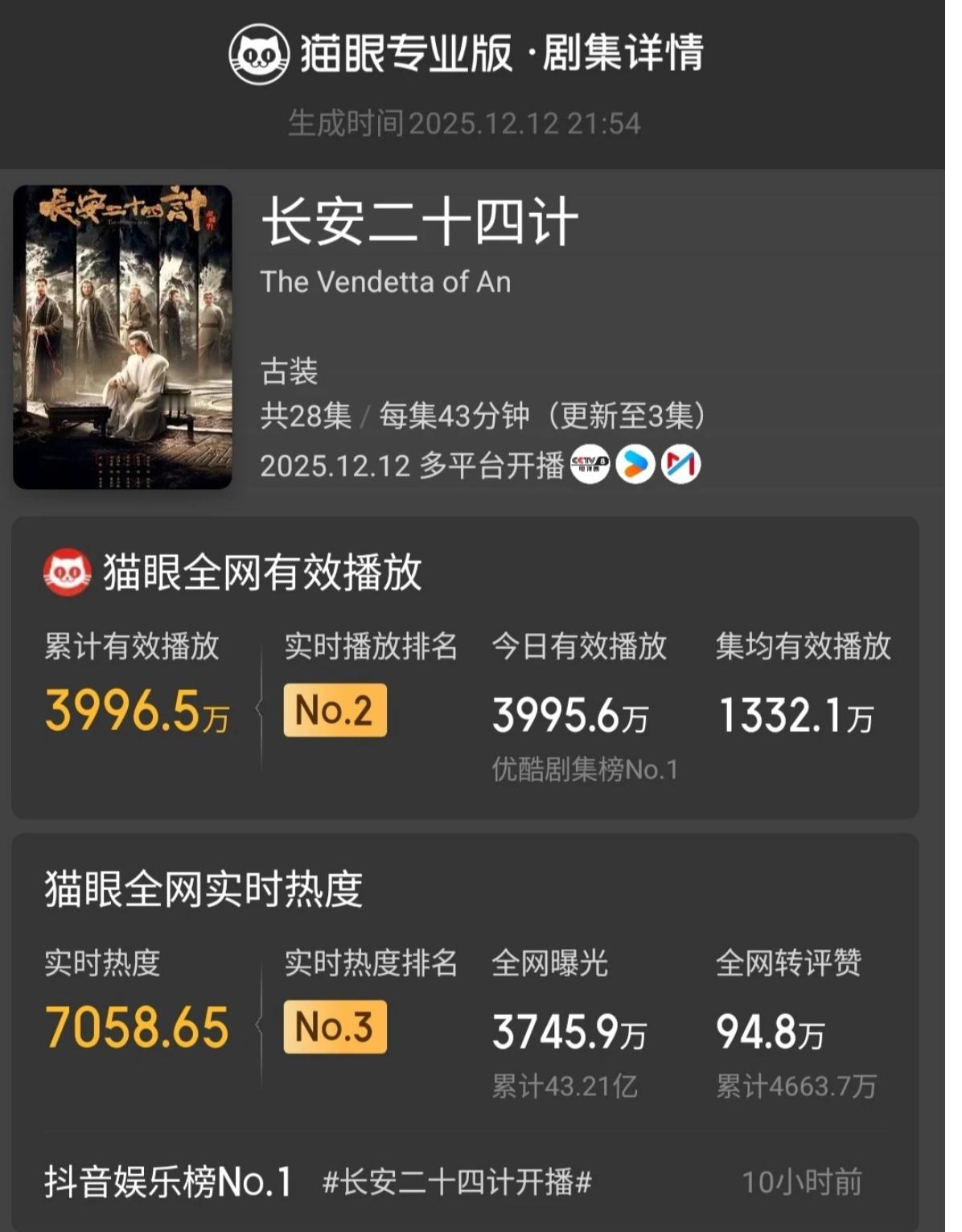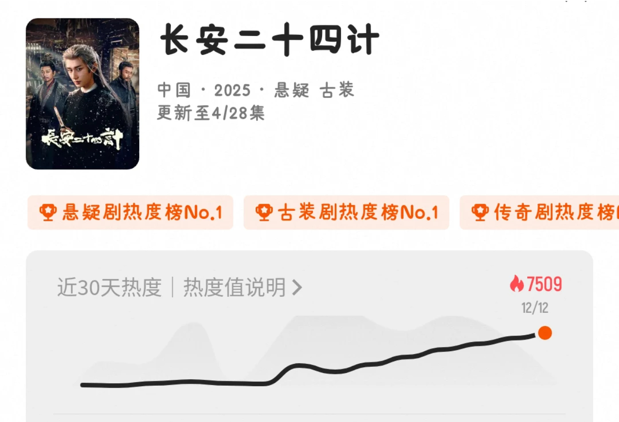 长安二十四计全网收视登顶长安二十四计走势良好,台网首播各项数据均表现不俗。谢淮安有勇有谋,复仇不拖泥带水,做人不圣母心泛滥,拒绝烂好人套路,没有主角光环全靠智谋硬撑,成毅有剧本选择权后挑剧本的能力就显现出来了。