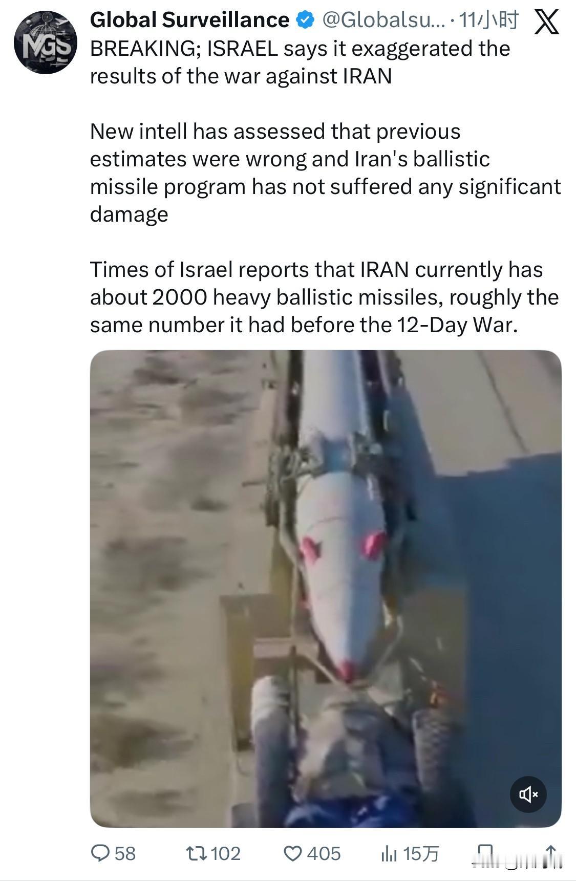 突发新闻:以色列媒体称夸大了对伊朗战争的结果 最新情报评估显示,之前的估计有误,伊朗的弹道导弹计划并未遭受任何重大损失。 《以色列时报》报道称,伊朗目前拥有约 2000 枚重型弹道导弹,与 12 日战争前的数量大致相同。