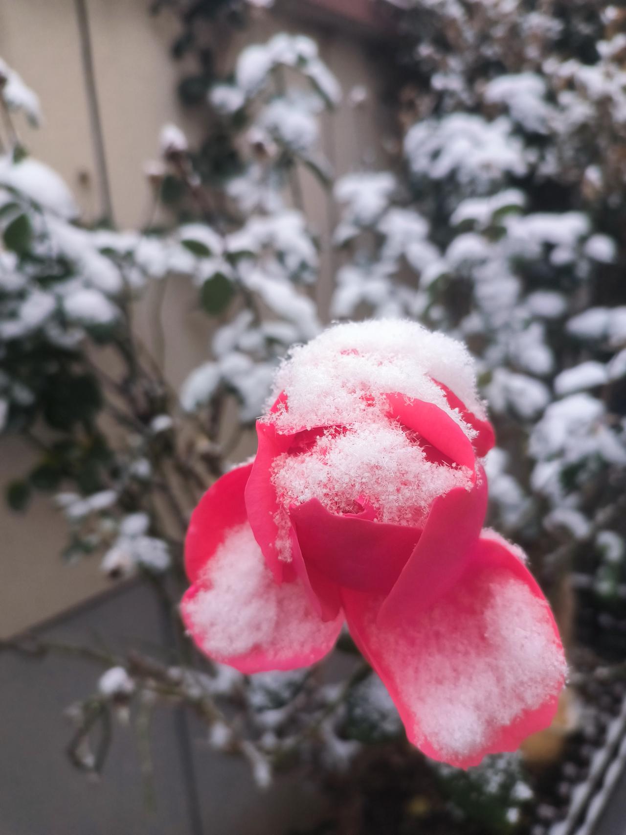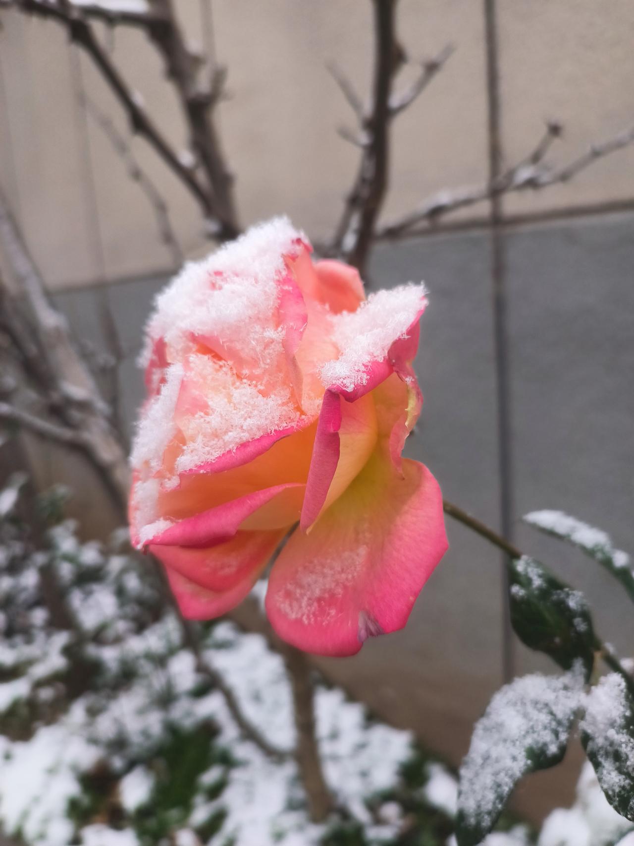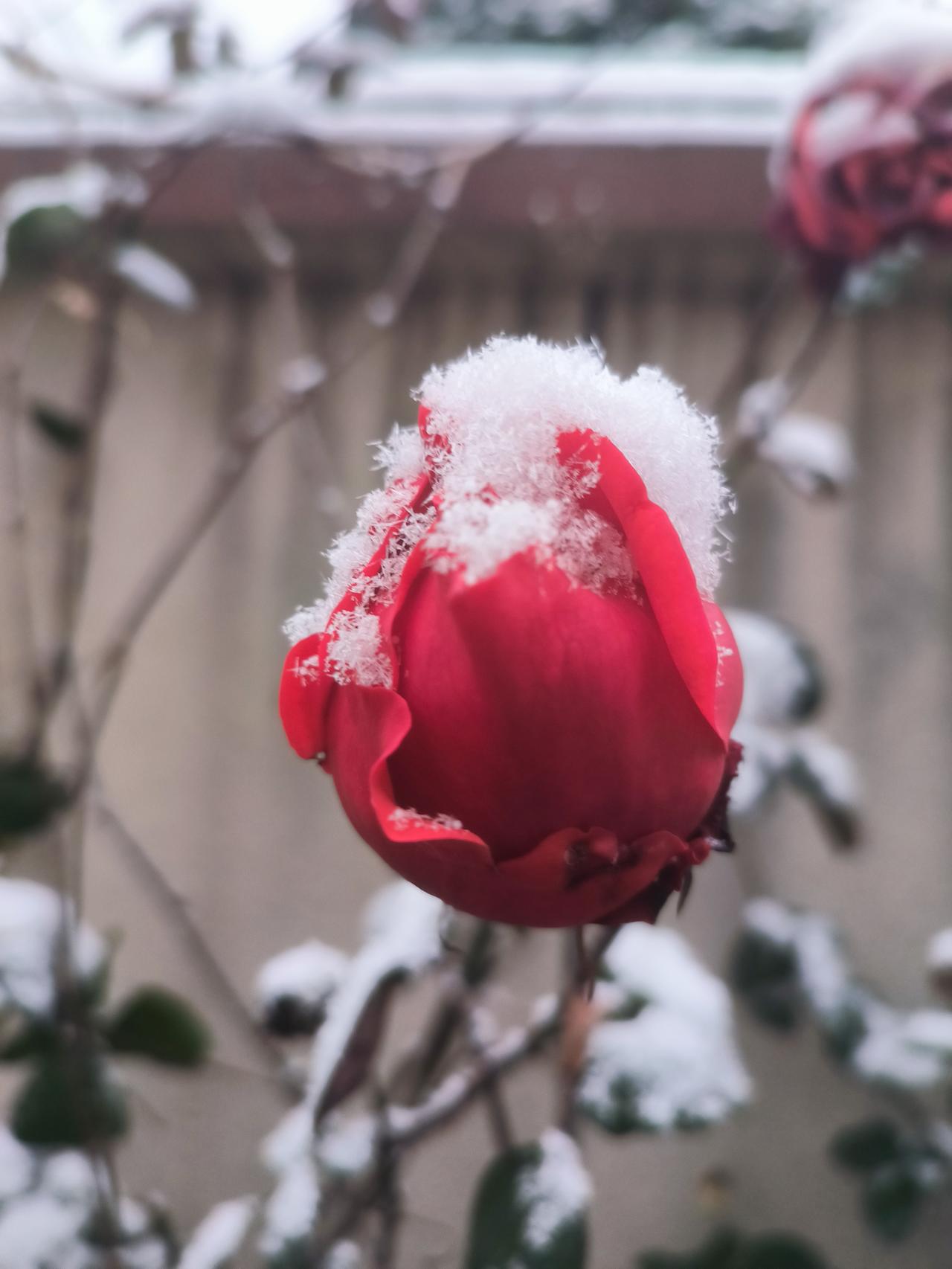 大雪节气之后,等了这么几天,雪还是来了。 昨天晚上开始,好友就在群里说下雪了,晚上九点多钟的时候又喊雪下大了。 像个孩子似的,这雪能下多大呢?天气预报上说,只是雨夹雪而已。气温这么高,落到地上也就融化了。 今天早上朋友圈里到处晒雪,看来真下的不小。 入冬以来,天气干燥,是应该下雪了。 赶紧起床,到外面拍雪景,担心晚了,就看不到了。 地面上几乎没有,只有在草木上面,车子上面有一些雪。 不能“哇塞,下雪了”,显得一惊一乍。于是拍了几张图片,学着古人拼一句: 老树长叹花不在,唤得飞雪枝上来。 下雪了