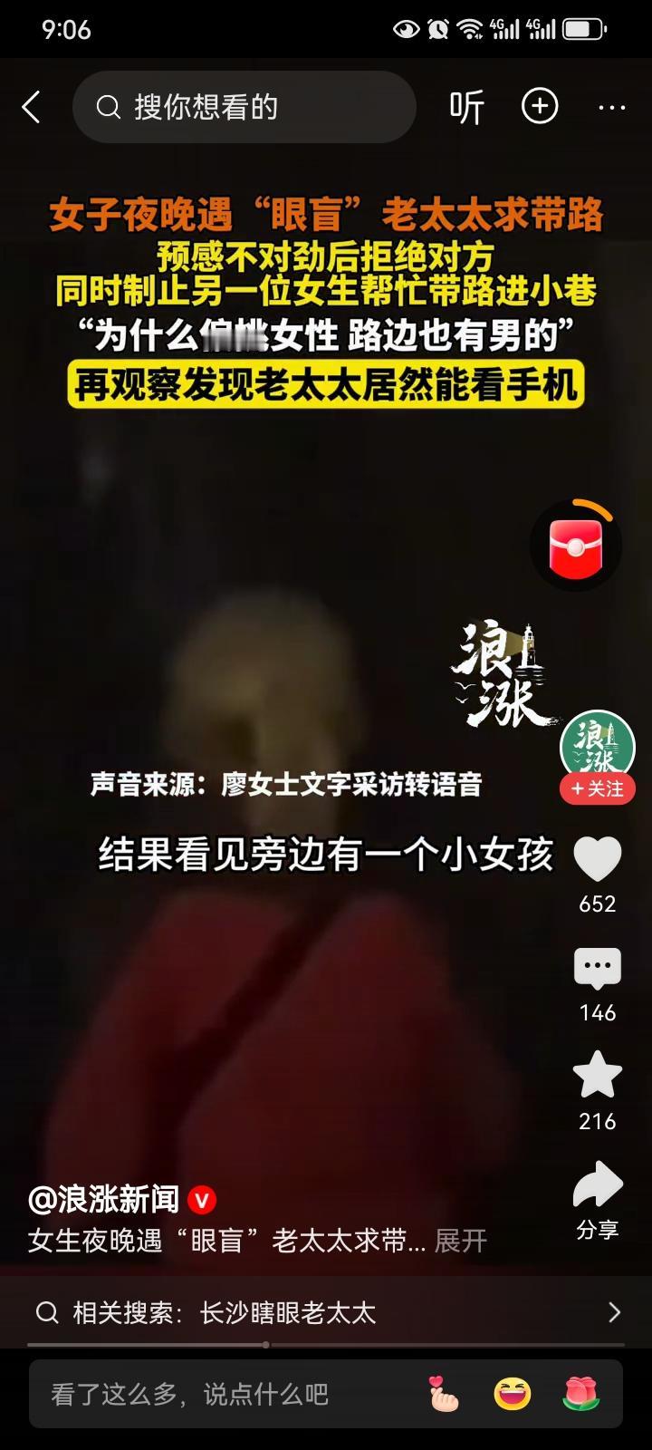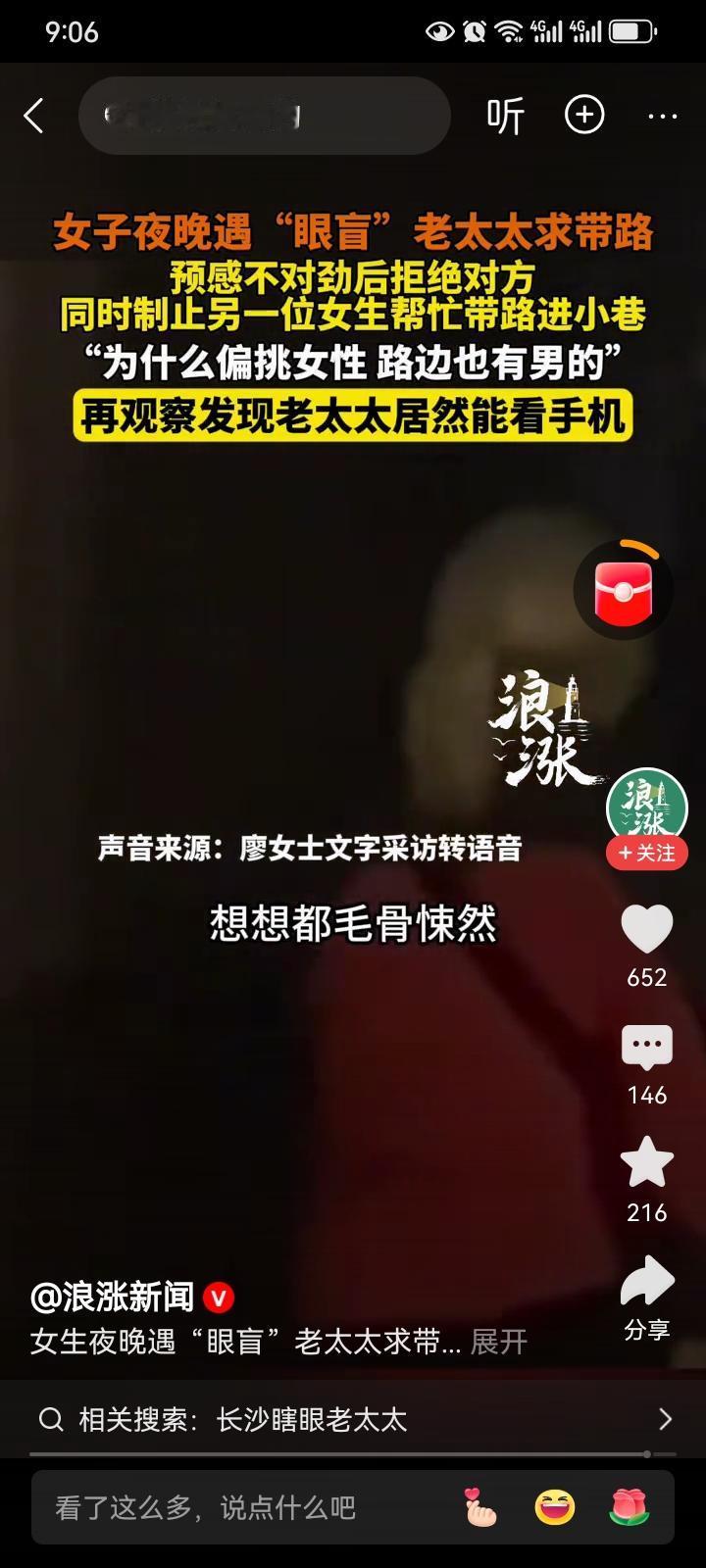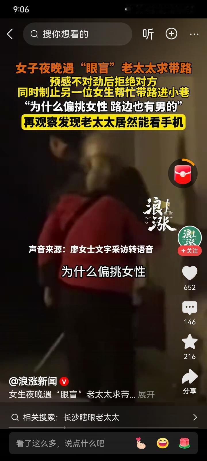 夜晚女生遇“眼盲”老太求带路,预感不妙拒绝,还制止另一女孩帮老人。谁知,接下来发生的一幕让她毛骨悚然! 真的是细思极恐!快过年了,骗子们都在努力完成业绩吗?!这骗术真是防不胜防! 湖南长沙,一女孩分享了自己一段可怕的经历,同时提醒夜晚外出的女孩子们一定要谨慎再谨慎! 是怎么一回事儿呢? 12月11日晚,廖女士在路边遇到一个“眼盲”的老太太,老人白发花甲,手拿探路杖,一副不知所措的样子。 老太太开口向她求助,说希望廖女士能为自己带路,毕竟天黑自己眼睛又不方便,非常需要帮助。 按常理来说,这么“不方便”的老人,天黑了本不应该出来了,再就是出来也应该有家人陪伴,怎会独自一人呢?! 最不能理解的是,廖女士说,路边也有男的,为什么偏偏挑选女性呢?! 想起网上那些诱骗女孩的视频,廖女士本能的感觉到不对劲,于是果断拒绝了!害人之心不可有,但防人之心不可无!还是小心为上。 谁知,被廖女士拒绝后,“眼盲”老太太又开始寻找另一个女孩帮忙带路。果然,有一个女孩被说动了,并准备按老太太要求带路进一条黝黑的小巷。 出于谨慎和好心,廖女士赶紧制止了热心女孩帮助老太太带路。好在热心女孩反应也很快,看到有人提醒,立马懂了 然而,接下来发生的一幕简直是让人毛骨悚然。因为,廖女士发现,那个“眼盲”老太太走远后,居然在看手机!! 现在回想起来廖女士都觉得十分后怕! 不过有网友说:当时你可以报警,盲人用手机很正常,有的盲人有光感,或者是弱视,以前我的盲人同事两个小姑娘还经常晚上出去吃宵夜,另外一个过马路还翻栏杆,我也是服了,我都翻不过 但更多的网友则表示还是小心为妙:当年我女儿初一下夜自习,就遇到过一个老太太要帮助,叫我女送她回家,刚好在路上碰到了我儿子去接妹妹,老太太借故离开,我.儿子暗中跟踪看,果断在不远转弯处看见老太太上了一辆面包车走了!这就是典型的诱骗! 还有的说:我也是,有一回清早遇上两风尘仆仆的两夫妻,说自己来投奔亲戚没投着,饿了,没钱吃饭,让我给他们吃饭钱!这不是想得美吗?老子脖子上的玩意又不是摆设! 我当时就拒绝并走了,然后前面有两女大学生,我赶紧就拦她们,让她们警惕前面两骗子,会找你们要钱,可千万不能给啊!两女大学生很感谢,说他们找我们了!我们跑开的,还有点羞愧,你一说我们才觉得自己万幸! 早些年,我倒是在火车站遇到背着孩子的女人要钱,说是几天没吃饭了,因为当时还是学生也没什么钱,所以就没给 但,不管老太太是不是真瞎,谨慎一点总是好的。还记得那个孕妇诱骗女孩回家的案例吗? 2013年7月24日,黑龙江省桦南县发生一起诱骗少女奸杀案。桦南医院实习生胡某被孕妇欺骗喝下混合了迷药的酸奶,昏迷后遭到孕妇丈夫性侵,随后胡某被杀害并抛尸! 在这个看似温暖的世界里,善意是最珍贵的光,但却也容易被阴影觊觎。 长沙廖女士的经历像一面镜子,照出了人性的复杂:有人利用你的善良设局,有人却因你的提醒而躲过一劫。 神话里,神明赐人“慧眼”,不是为了怀疑一切,而是为了在伸出援手前看清真相。 真正的善良,不是盲目付出,而是带着智慧与边界的给予。 愿我们都能在保护好自己的前提下,把善意传递给值得的人,让温暖与警惕同行,让善良不再成为别人算计的筹码。 对此你们怎么看?你们有过这样的经历吗?