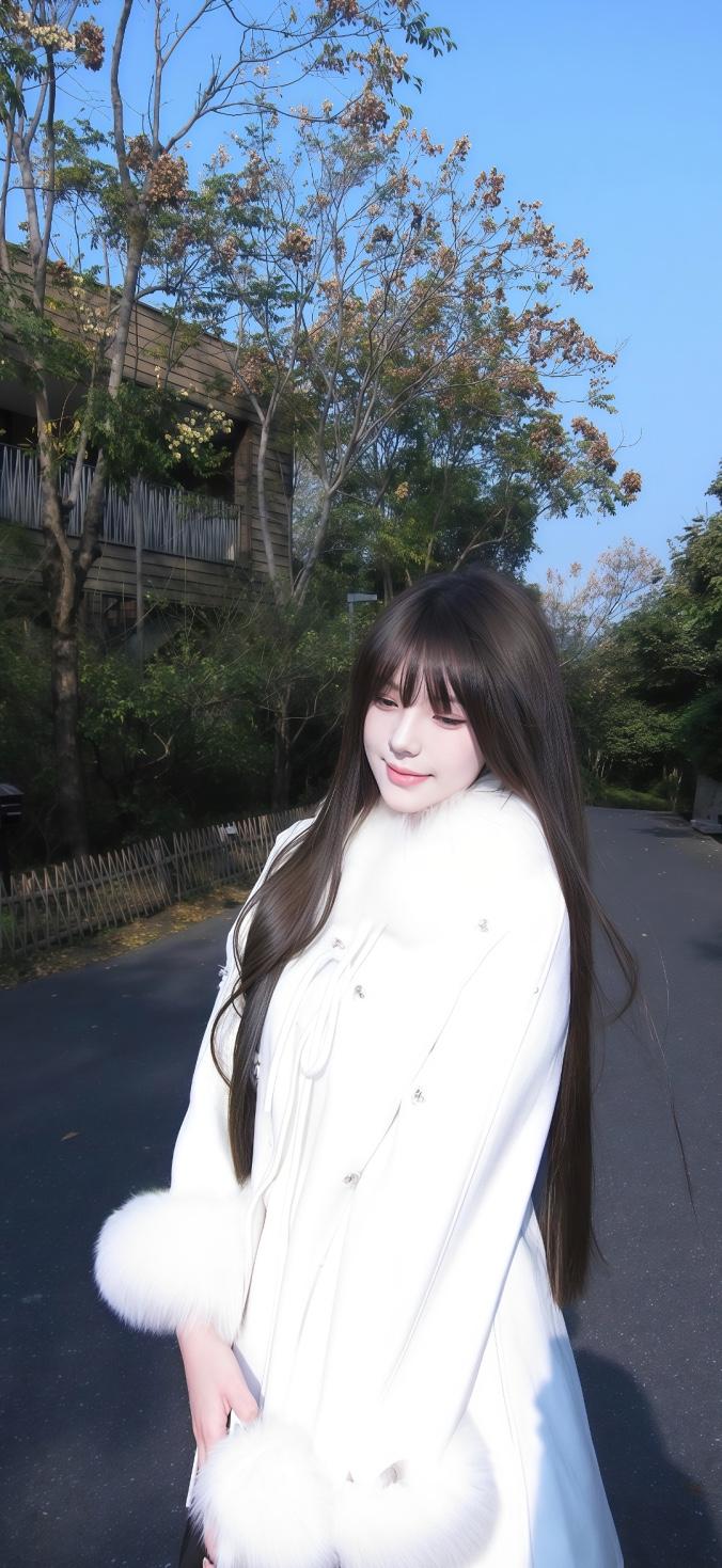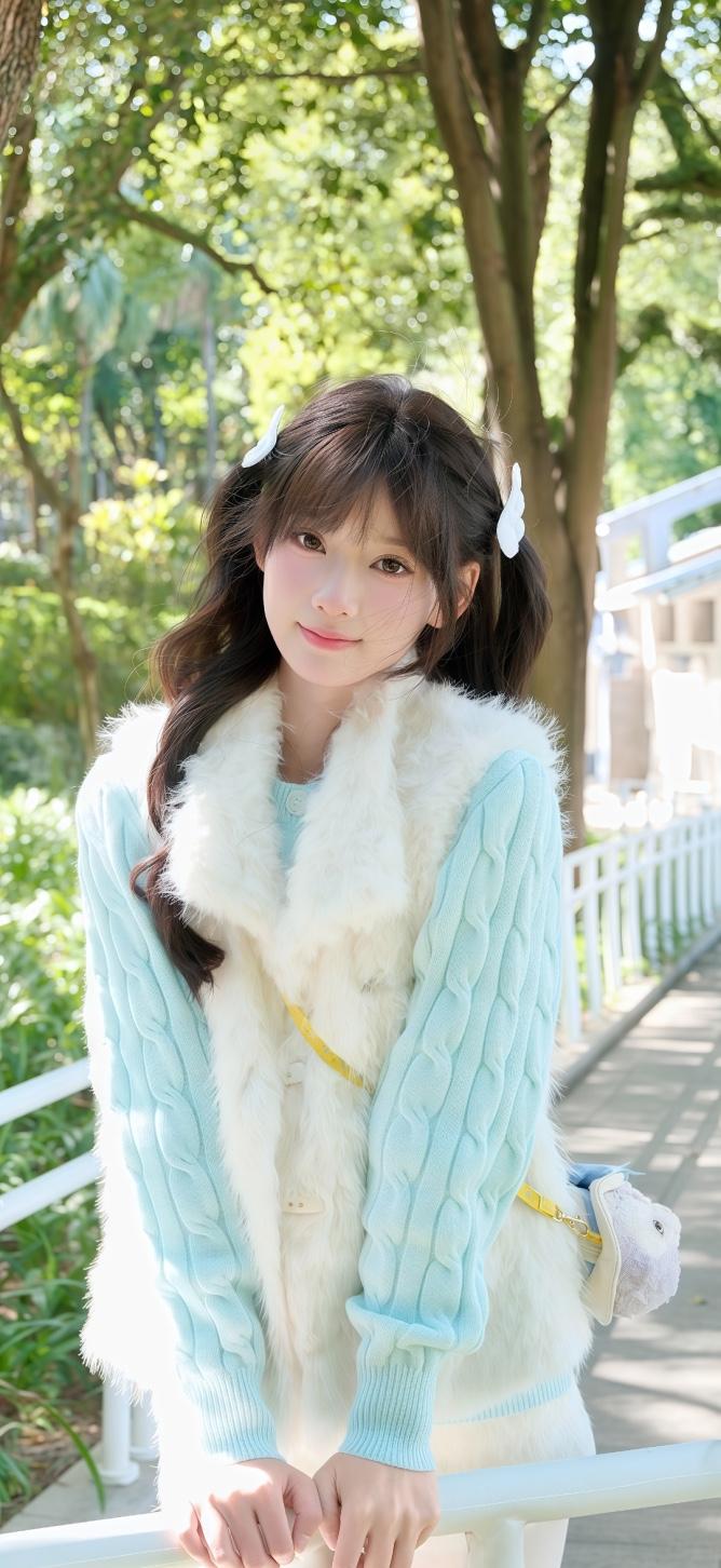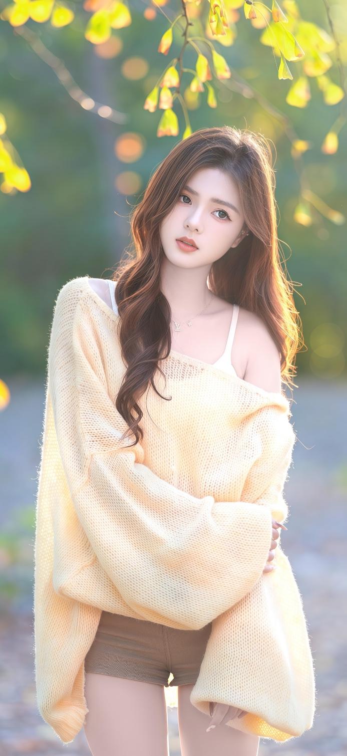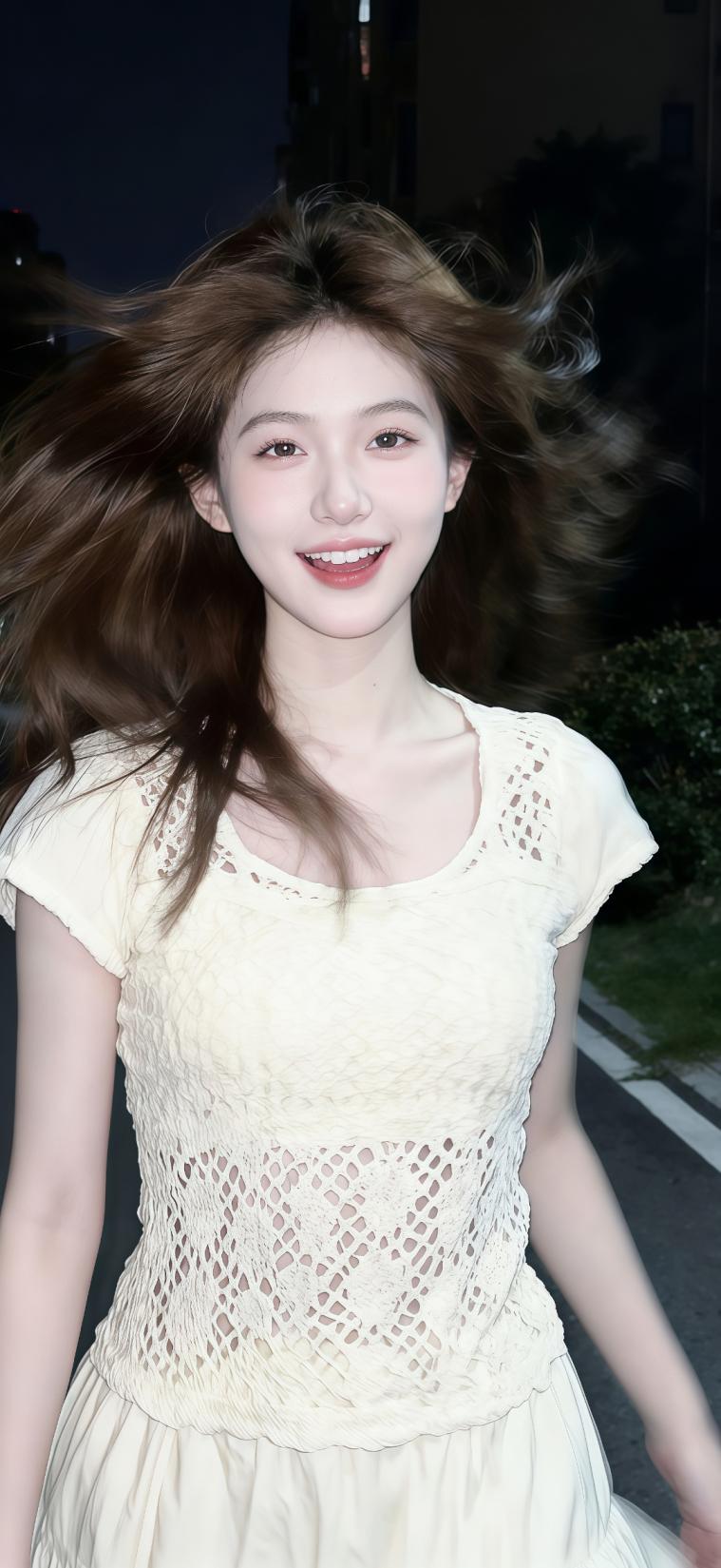 优雅蓝裙少女,手捧花束,漫步在夜晚的街头。