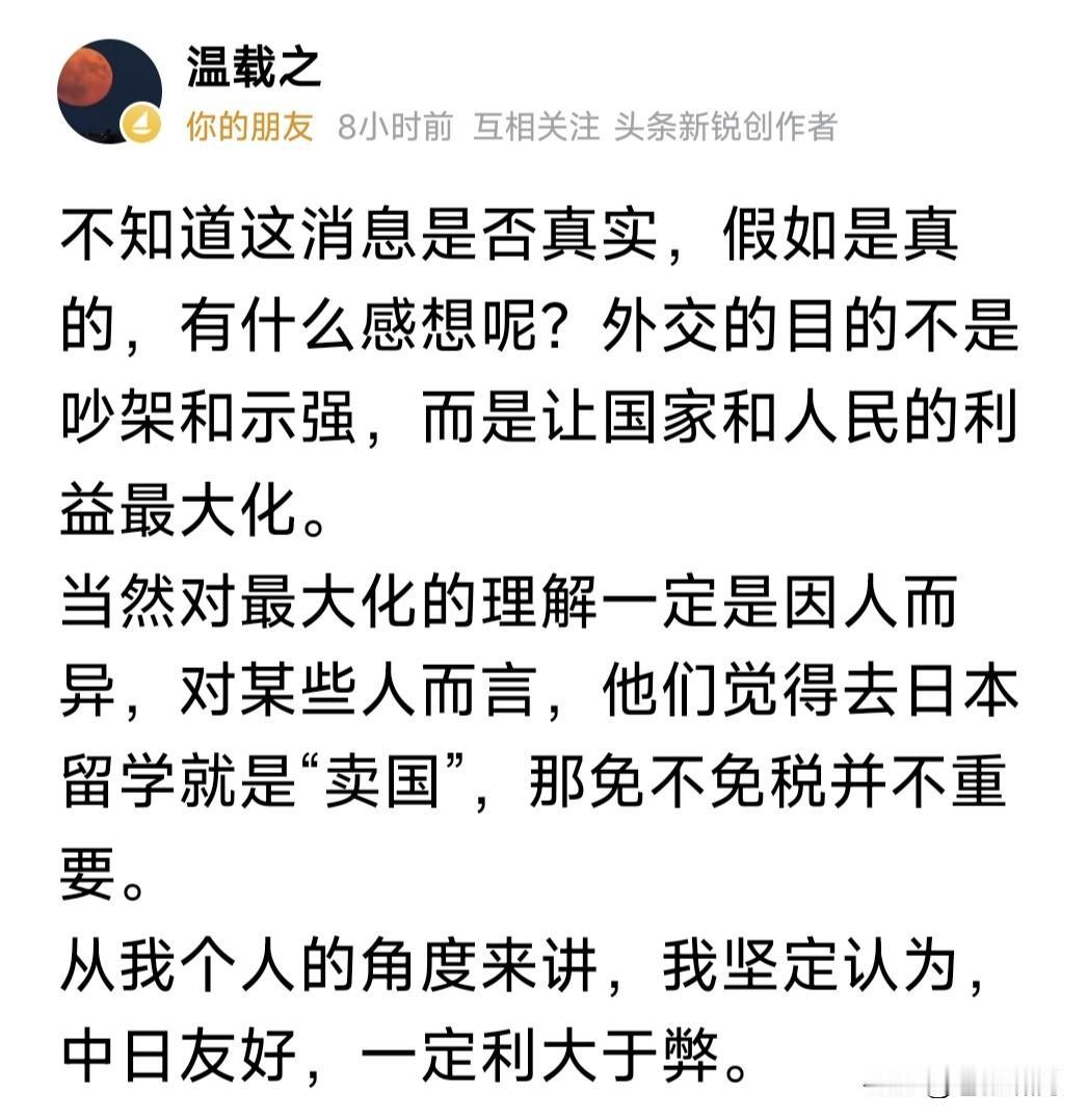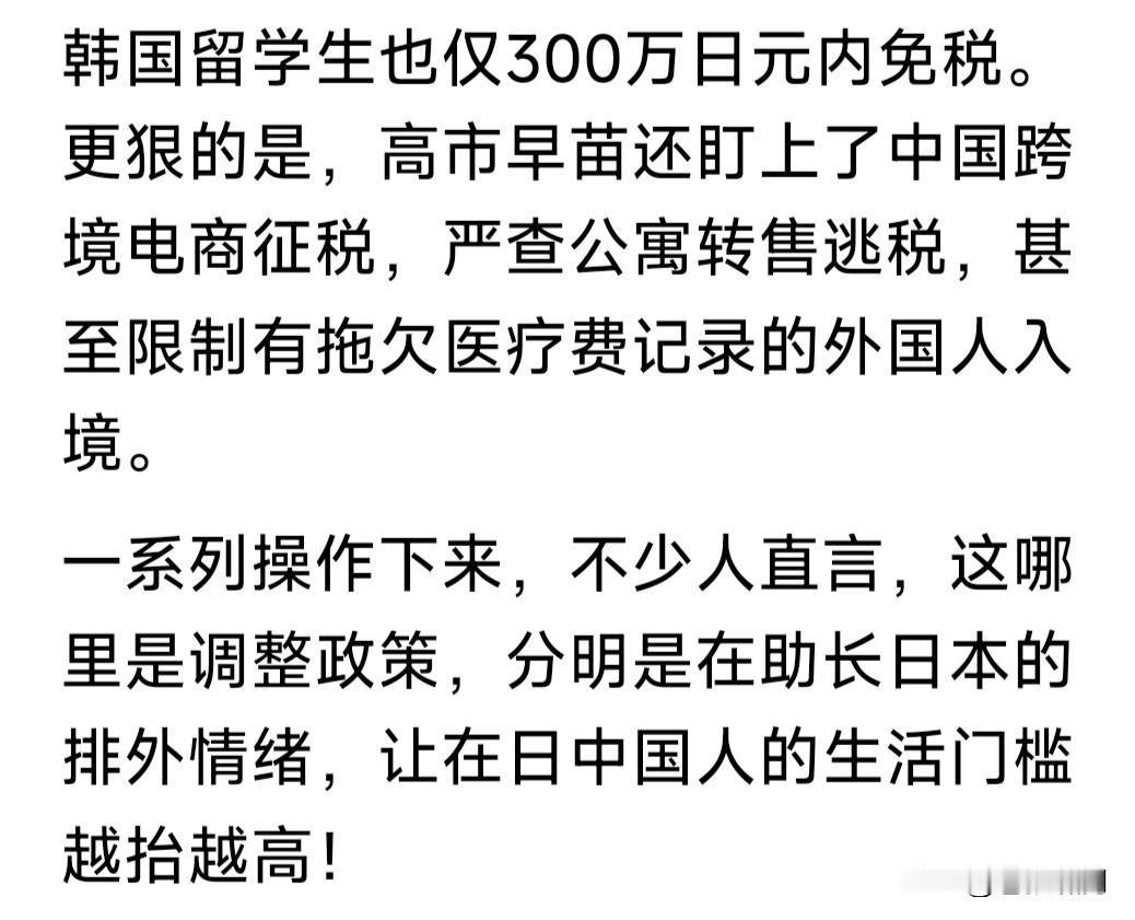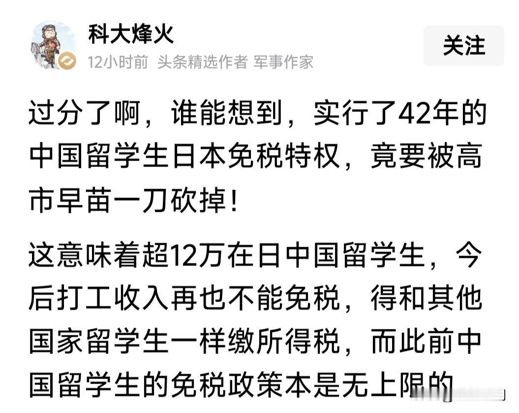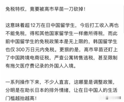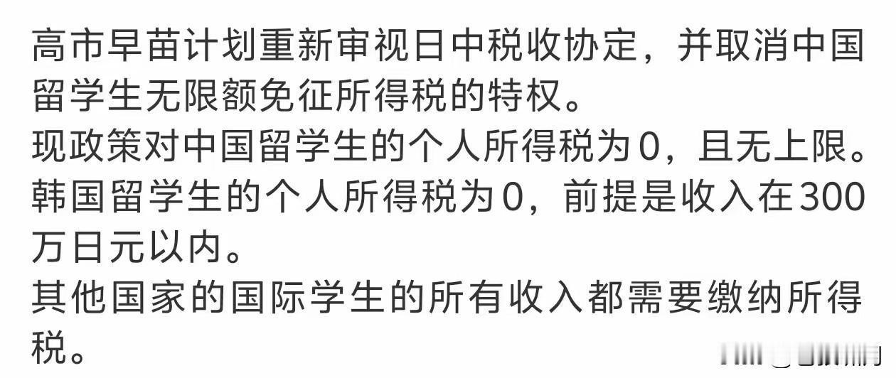 希望这是谣传!高市早苗要取消中国留学生“无限额免税”特权?根据中日税收协定,中国留学生在日待遇最好:所有人所得税为零,并且无上限。 韩国留学生次之:虽然他们也享受“免除所得税”,但收入需在300万以内,超出部分仍然收取所得税。其他国家留学生不免税,收入要交所得税。 什么意思?即中国留学生,在日本勤工俭学,无论打工挣多少钱,都免征所得税。韩国学生也可免,但收入限于300万以内。其他国家学生不免。 如此看来,这是对中国留学生的一个优惠政策,比日本盟友韩国还要优惠。现在高市要重新审视“中日税收协定”,取消中国留学生收入免费待遇,对于他们来说,无疑是一个不小压力! 高市太为何要这样做?是因发表“不当言论”,受到中国人民批评,不认错道歉,还想把怨气撒到中国留学生身上?也太“小家子气”了!两件事情一码归一码,怎么能混淆在一起呢? 实在令人不解!说到底不是政治家,只能算一个目光短浅的政客!奉劝高市首相知错改错,不要在错误的路上越走越远,影响中日经济发展啊! …………