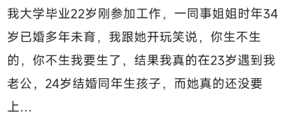 我跟她开玩笑说,你不生我要生了,结果我真的在23岁遇到我老公,24岁结婚同年生孩子,而她真的还没要上
