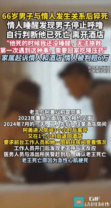 “他死的时候,我还没睡醒!”广西,66岁男子与情人在酒店发生关系后猝死。情人醒后,发现男子停止呼噜声,便自行判断其已死亡,随即离开了酒店。男子家属得到消息后,直接将情人和酒店告上了法庭索赔55万元! 来源:【观威海】 原来,老王(化名)和阿美(化名)以前是同事关系,2023年两人重新见面后,便多次相约见面! 2024年7月14日,老王于12时55分到当地一家酒店开了一间房。约两小时后,阿美来到房间与他会面! 下午5时43分,阿美独自离开房间。一个多小时后,她返回酒店,要求工作人员陪同查看房间情况! 工作人员开门后发现老王已无反应,立即拨打了急救和报警电话。医护人员和民警赶到后,确认老王已死亡! 警方排除了刑事案件可能,社区卫生服务中心出具的死亡医学证明推断,死因为急性心肌梗死。老王家属在庭审时透露,他本身患有高血压、脑梗等基础疾病! 法庭上,双方各执一词。阿美辩称,自己当时也患有高血压,事发时因恐慌导致身体不适,才离开现场回家服用降压药! 她强调“第一次遇到这种事”,且事发时自己尚未睡醒,无法进行施救。 死者老王的妻儿则向阿美和酒店经营者提出55万余元的索赔请求! 酒店方面辩称,老王死亡地点在房间内而非公共区域,酒店无法实时监控房间内情况,已尽到合理安全保障义务! 法院审理认为,老王作为成年人,应对自身健康安全承担首要责任。他的死亡系自身突发疾病引起,应承担主要责任! 法院同时指出,阿美虽非法定救助义务人,但二人作为关系密切的男女朋友,在老王身体异常且无他人在场时,有责任提供帮助! 法官在判决书中强调,阿美发现异常后未拨打急救电话,也未采取任何救治措施,而是自行判断老王已死亡并离开,导致错过了最佳救治时机! 最终,法院判决,老王自身疾病是死亡主因,承担主要责任;而阿美未能及时救助,需承担10%的次要责任,赔偿6.2万余元。酒店因已尽安全保障义务被判无责! 判决结果公布后,舆论迅速分化! 支持方认为,生命至上是最基本的社会准则,阿美的行为明显违背了道德义务。部分网友甚至表示“6万多赔少了”,认为无论关系是否正当,发现他人有生命危险都应首先施救! 反对方则认为,老王作为有基础疾病的成年人,应对自身行为负责。他们质疑阿美作为非专业人士,如何准确判断对方是猝死而非沉睡。也有声音指出,婚外情双方均有过错,责任不应仅由一方承担! 一场始于隐秘幽会的相遇,最终以死亡和赔偿收场。两个家庭的生活轨迹因此改变,而法律的天平在衡量生命价值与道德责任时,给出了它的判断——当生命消逝的瞬间,救助的义务超越了关系的正当与否!