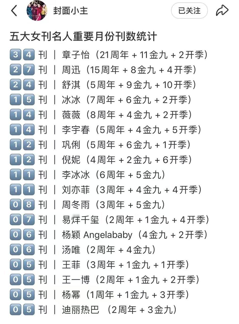 时尚博主统计了五大刊重要月份5刊以上的明星只有18位65后 巩俐、王菲70后 周迅、李冰冰75后章子怡、舒淇、赵薇、汤唯80后 李宇春、范冰冰85后 刘亦菲、杨幂、杨颖、倪妮 90后 周冬雨、迪丽热巴95后 王一博00后 易烊千玺