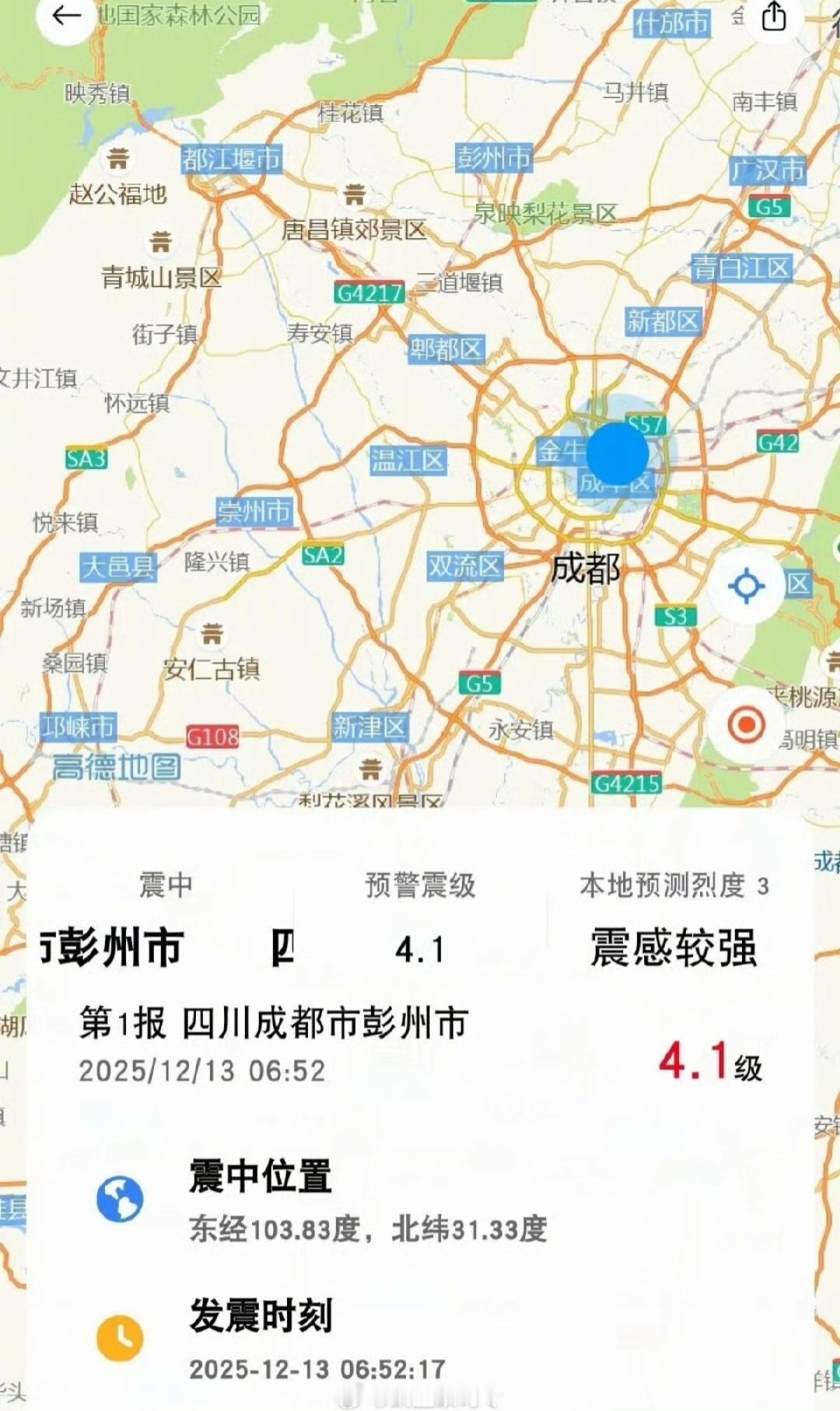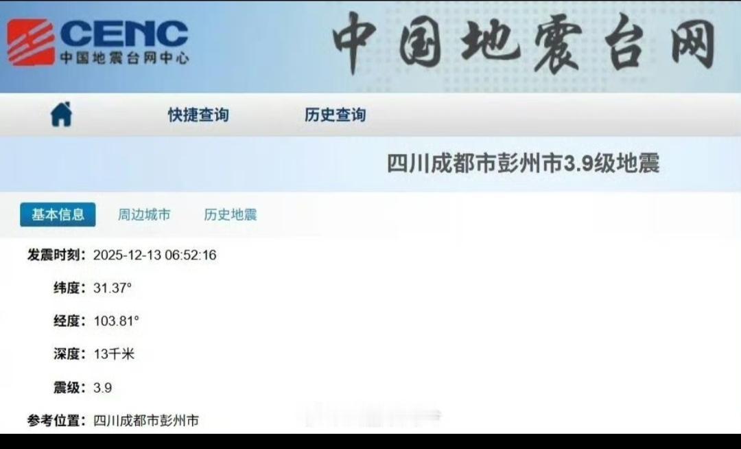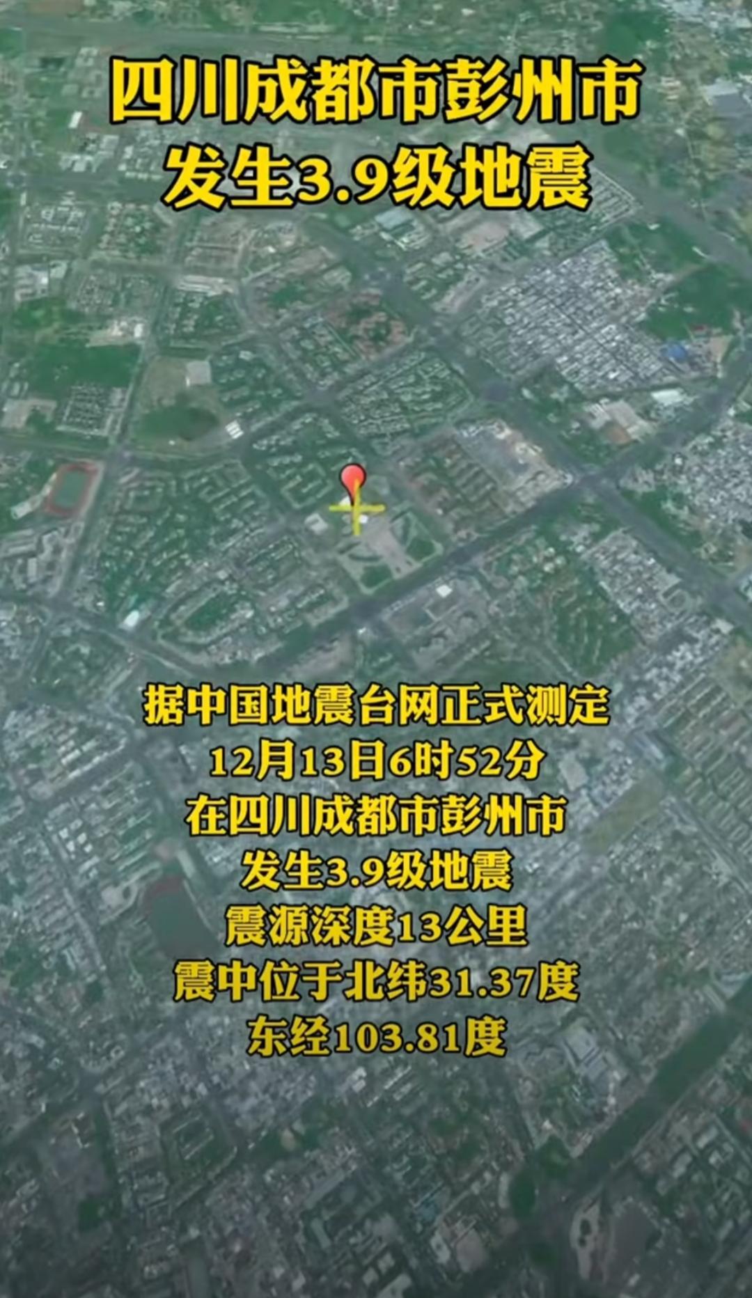 2025年12月13日6时52分,四川成都市彭州市(北纬31.37度,东经103.81度)发生了3.9级地震,震源深度13公里。 不少当地市民反馈有明显震感,部分住户被摇醒,还有人提前15秒收到地震预警,目前暂未听闻有人员伤亡和房屋损坏的情况。该震中距成都市区约92公里,市区部分人也能感觉到晃动。 地震避险牢记这几点:室内避险:桌下承重墙根避险,护头颈,弃电梯走楼梯,室外避险:空旷地带才安全,远离高楼电杆广告牌,特殊场景:车内靠边停,山区防滑坡,震后须知:不贪财听指挥,防余震防燃气泄漏!地震分布图 地震分布规律 地震攻略 地震常识 地震成因 彭州 地震2025