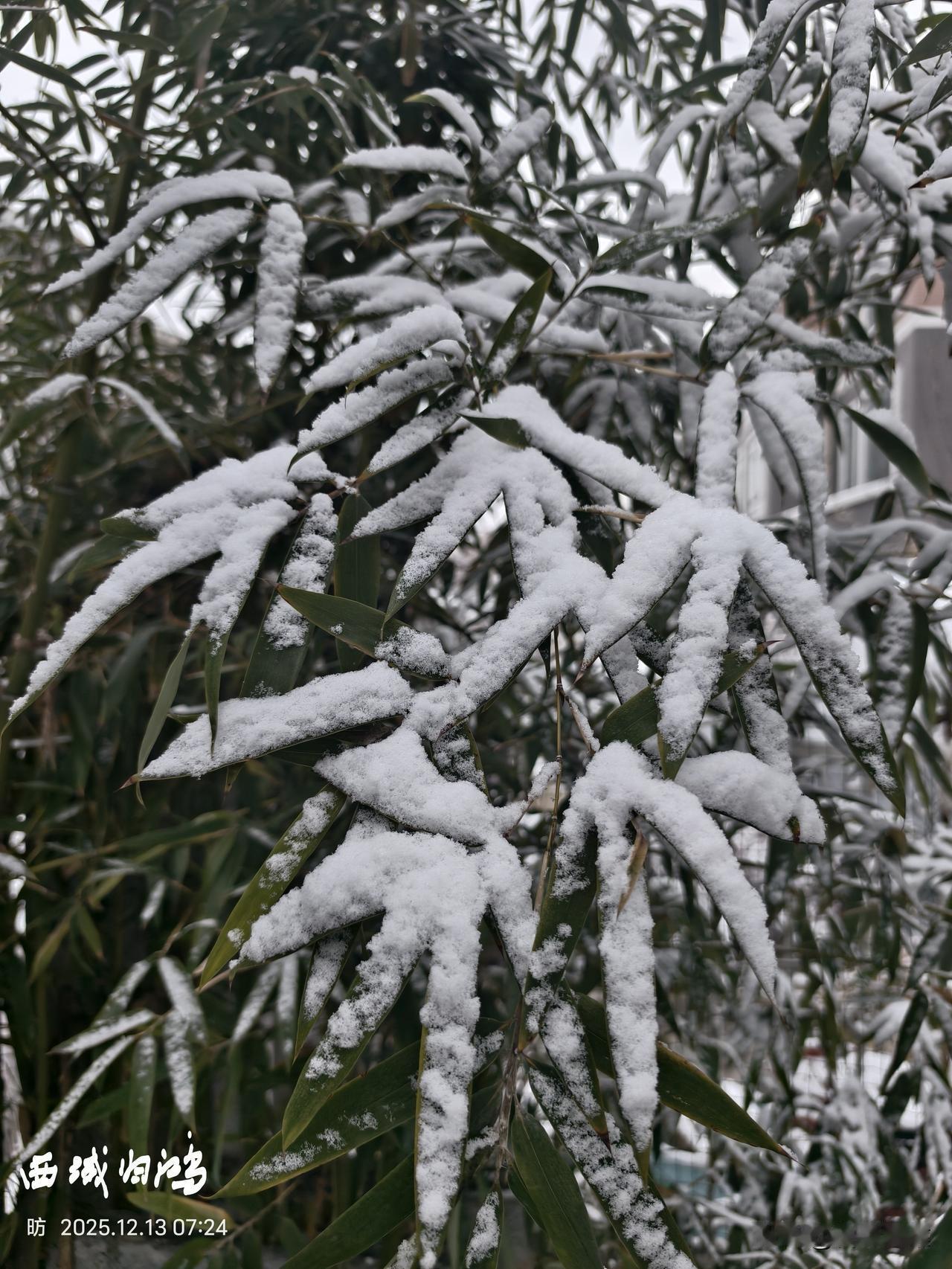 12月13日,东营的雪不大,但也别有韵味,芦苇,树木,青竹都披了一层薄薄的雪,正是:坐看青竹变琼枝。